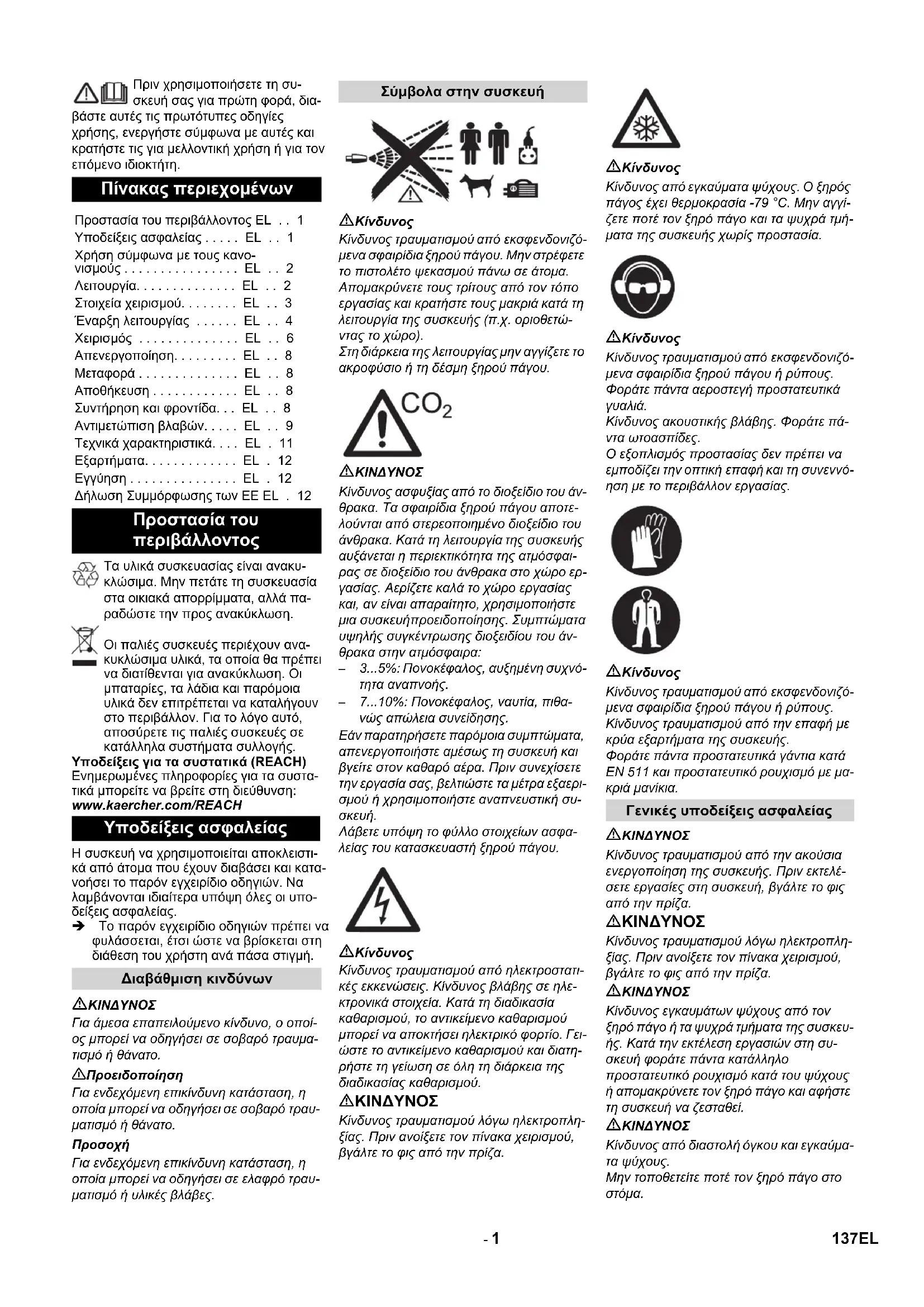 • EL Τεχνικά χαρακτηριστικά EL . 11 Εξαρτήματα EL . 12 Εγγύηση EL . 12 Δήλωση Συμμόρφωσης των ΕE EL . 12 Προστασία του περιβάλλοντος Υποδείξεις ασφαλείας Διαβάθμιση κινδύνων Σύμβολα στην συσκευή Γενικές υποδείξεις ασφαλείας 137EL- 2 p. 9