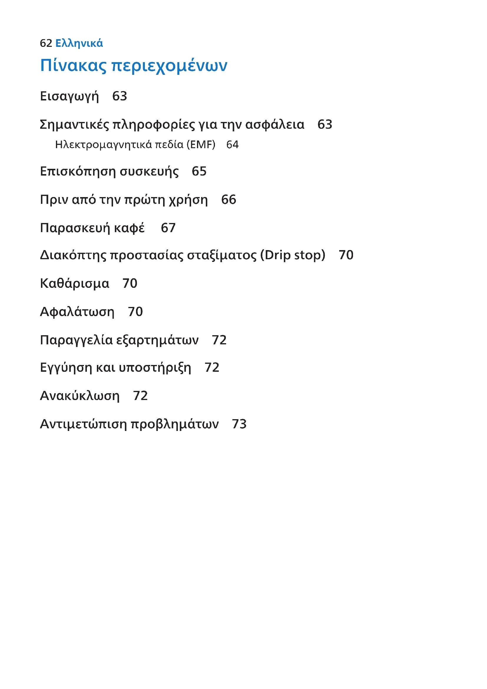 - Wenn Sie die Kanne länger als 20 Sekunden während des Brühvorgangs aus dem Gerät entfernen, läuft der Filter über. 61DeutschΠίνακας περιεχομένων Εισαγωγή 63 Σημαντικές πληροφορίες για την ασφάλεια 63 Ηλεκτρομαγνητικά πεδία (EMF) 64 Επισκόπηση συσκευής 65 Πριν από την πρώτη χρήση 66 Παρασκευή καφέ 67 Διακόπτης προστασίας σταξίματος (Drip stop) 70 Καθάρισμα 70 Αφαλάτωση 70 Παραγγελία εξαρτημάτων 72 Εγγύηση και υποστήριξη 72 Ανακύκλωση 72 Αντιμετώπιση προβλημάτων 73 62 ΕλληνικάΕισαγωγή Συγχαρητήρια για την αγορά σας και καλώς ήρθατε στη Philips! Για να επωφεληθείτε πλήρως από την υποστήριξη που παρέχει η Philips, καταχωρήστε το προϊόν σας στην ιστοσελίδα www.philips.com/welcome. Σημαντικές πληροφορίες για την ασφάλεια Διαβάστε αυτές τις σημαντικές πληροφορίες προσεκτικά πριν χρησιμοποιήσετε τη συσκευή και φυλάξτε τις για μελλοντική αναφορά.