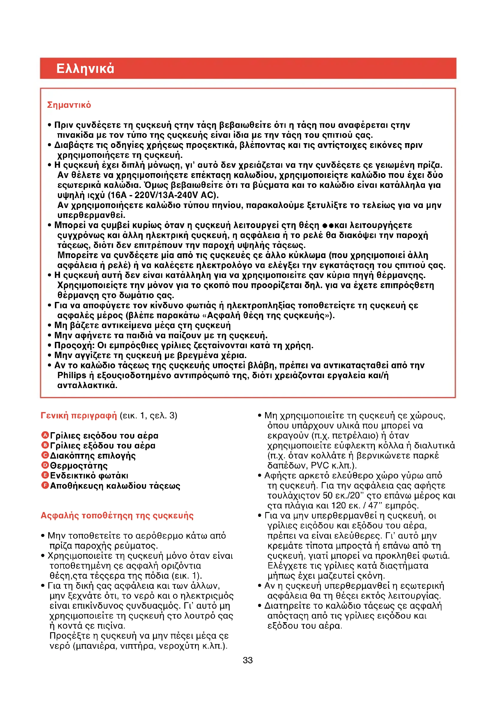 - Aν το καλώδιο τάσεωσ τησ συσκευήσ υποστεί βλάβη, πρέπει να αντικατασταθεί απ την Philips ή εξουσιοδοτηµένο αντιπρσωπ τησ, διτι χρειάζονται εργαλεία και/ή ανταλλακτικά.