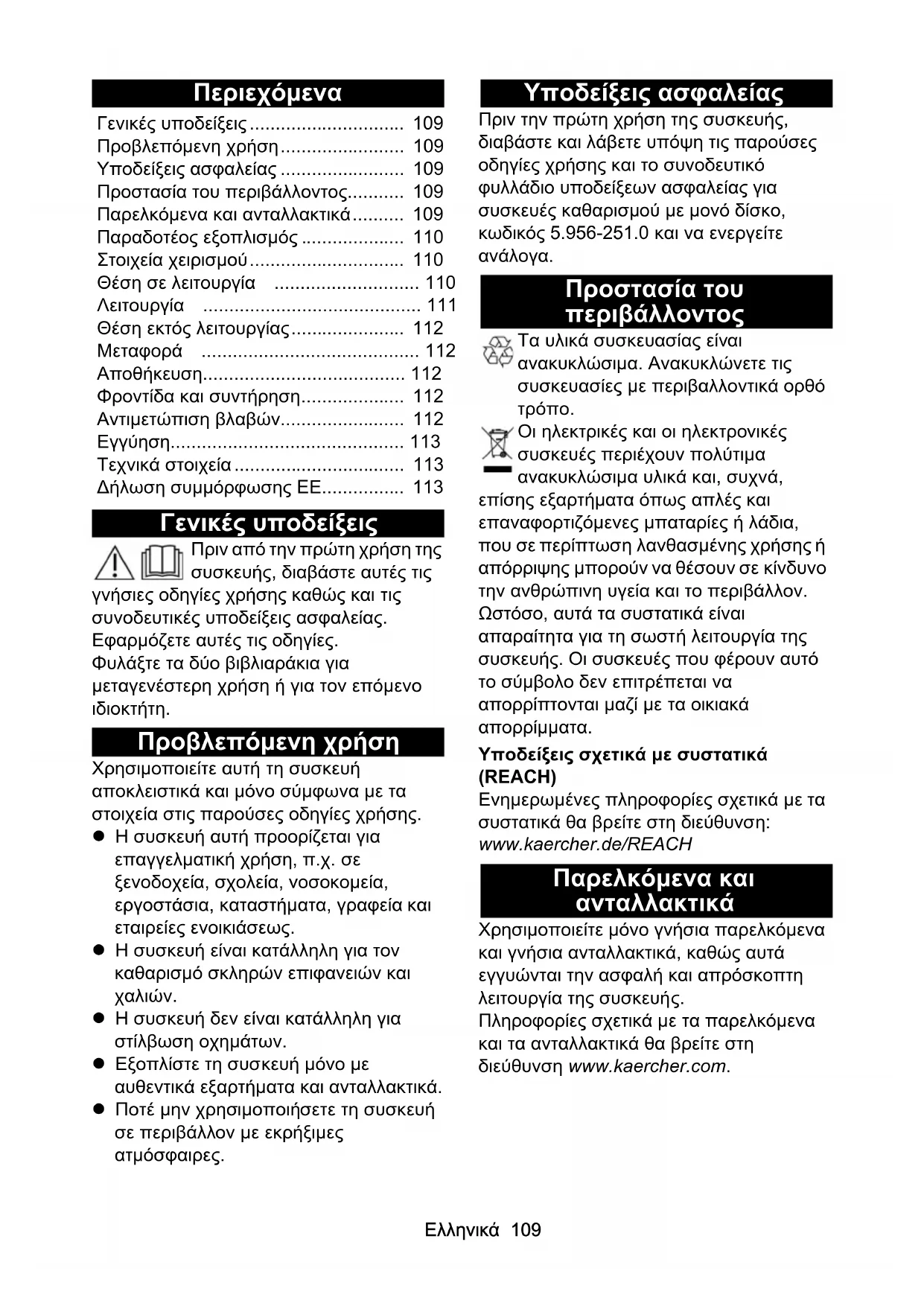 - Οι ηλεκτρικές και οι ηλεκτρονικές συσκευές περιέχουν πολύτιμα ανακυκλώσιμα υλικά και, συχνά, επίσης εξαρτήματα όπως απλές και επαναφορτιζόμενες μπαταρίες ή λάδια, που σε περίπτωση λανθασμένης χρήσης ή απόρριψης μπορούν να θέσουν σε κίνδυνο την ανθρώπινη υγεία και το περιβάλλον. Ωστόσο, αυτά τα συσ τατικά είναι απαραίτητα για τη σωστή λειτουργία της συσκευής. Οι συσκευές που φέρουν αυτό το σύμβολο δεν επιτρέπεται να απορρίπτονται μαζί με τα οικιακά απορρίμματα. Υποδείξεις σχετικά με συστατικά (REACH) Ενημερωμένες πληροφορίες σχετικά με τα συστατικά θα βρείτε στη διεύθυνση: www.kaercher.de/REACH Παρελκόμενα και ανταλλακτικά Χρησιμοποιείτε μόνο γνήσια παρελκόμενα και γνήσια ανταλλακτικά, καθώς αυτά εγγυώνται την ασφαλή και απρόσκοπτη λειτουργία της συσκευής. Πληροφορίες σχετικά με τα παρελκόμενα και τα ανταλλακτικά θα βρείτε στη διεύθυνση www.kaercher.com. Γενικές υποδείξεις p. 109