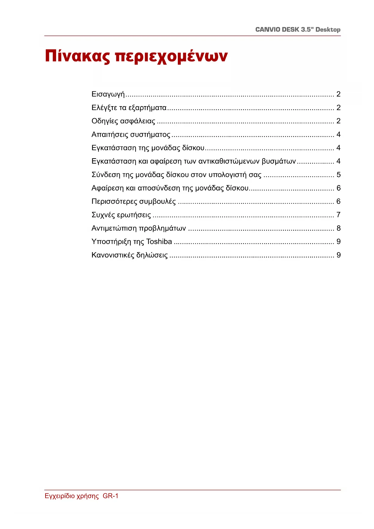 Σας ευχαριστούμε που επιλέξατε τη μονάδα σκληρού δίσκου Canvio Desk 3,5" Desktop της TOSHIBA. ∆ιαβάστε προσεκτικά αυτό το Εγχειρίδιο χρήσης, καθώς περιέχει όλες τις σχετικές πληροφορίες για την εγκατάσταση, τη χρήση και τη συντήρηση της μονάδας δίσκου καθώς και συμβουλές για την ασφάλεια. Σε περίπτωση που η μονάδα δίσκου δεν συμπεριφέρεται όπως αναμένεται, ανατρέξτε στην ενότητα “Συχνές ερωτήσεις” στο τέλος αυτού του εγχειριδίου. Ελέγξτε τα εξαρτήματα Αυτό το Εγχειρίδιο χρήσης έχει αποσταλεί στην ίδια τη μονάδα δίσκου. Συνιστούμε να δημιουργήσετε εφεδρικά αντίγραφα του εγχειριδίου χρήσης σε ένα CD ή στην τοπική μονάδα δίσκου αμέσως μετά την εγκατάσταση της μονάδας δίσκου. Οδηγίες ασφάλειας Τηρείτε προσεκτικά τις παρακάτω προφυλάξεις για αποφυγή δυσλειτουργίας ή βλάβης της μονάδας δίσκου. Warranty Card Canvio Desk 3,5" Desktop (συμπεριλαμβάνεται εγχειρίδιο