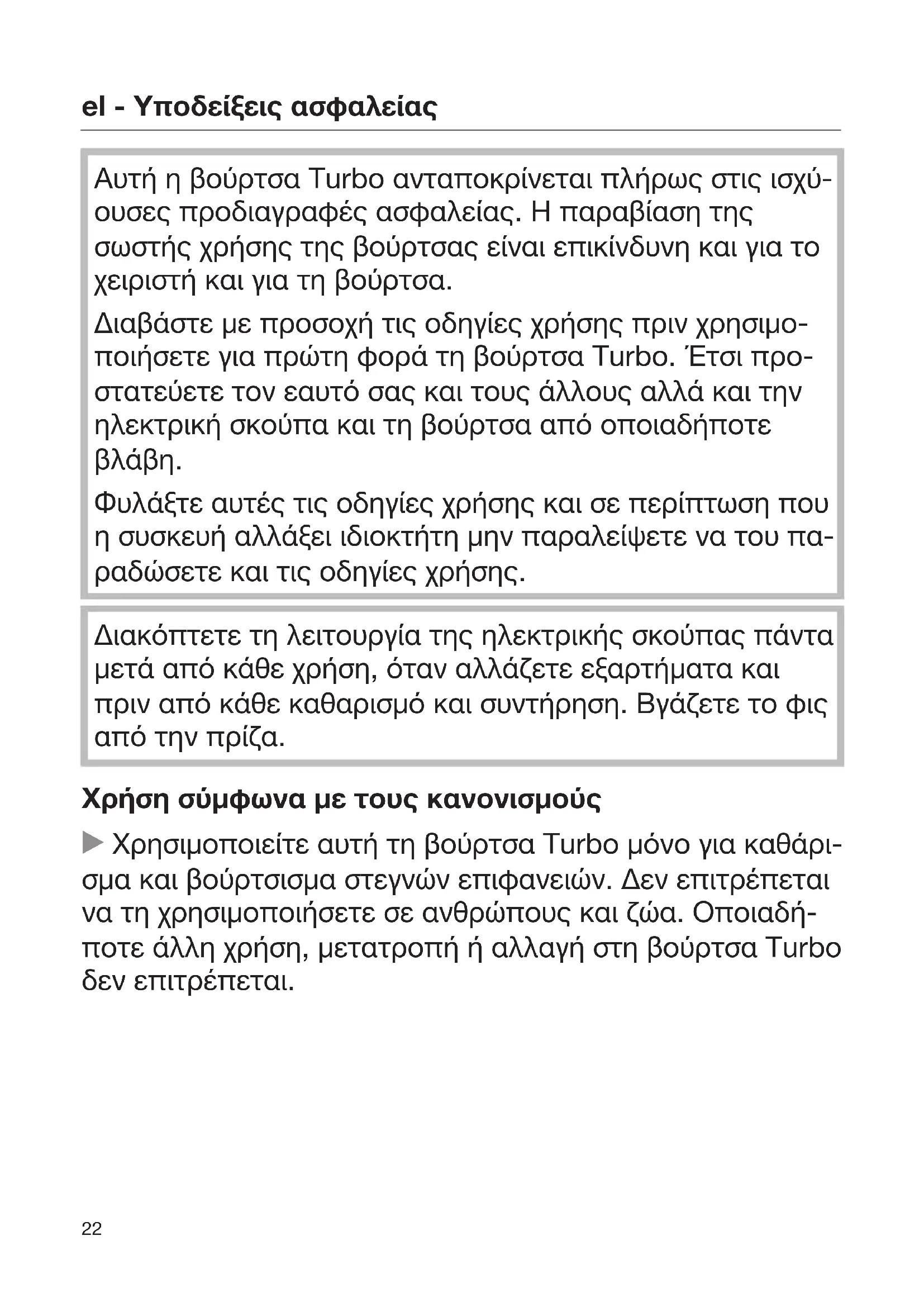 Αυτή η βούρτσα Turbo ανταποκρίνεται πλήρως στις ισχύ- ουσες προδιαγραφές ασφαλείας. Η παραβίαση της σωστής χρήσης της βούρτσας είναι επικίνδυνη και για το χειριστή και για τη βούρτσα. Διαβάστε με προσοχή τις οδηγίες χρήσης πριν χρησιμο- ποιήσετε για πρώτη φορά τη βούρτσα Turbo. Έτσι προ- στατεύετε τον εαυτό σας και τους άλλους αλλά και την ηλεκτρική σκούπα και τη βούρτσα από οποιαδήποτε