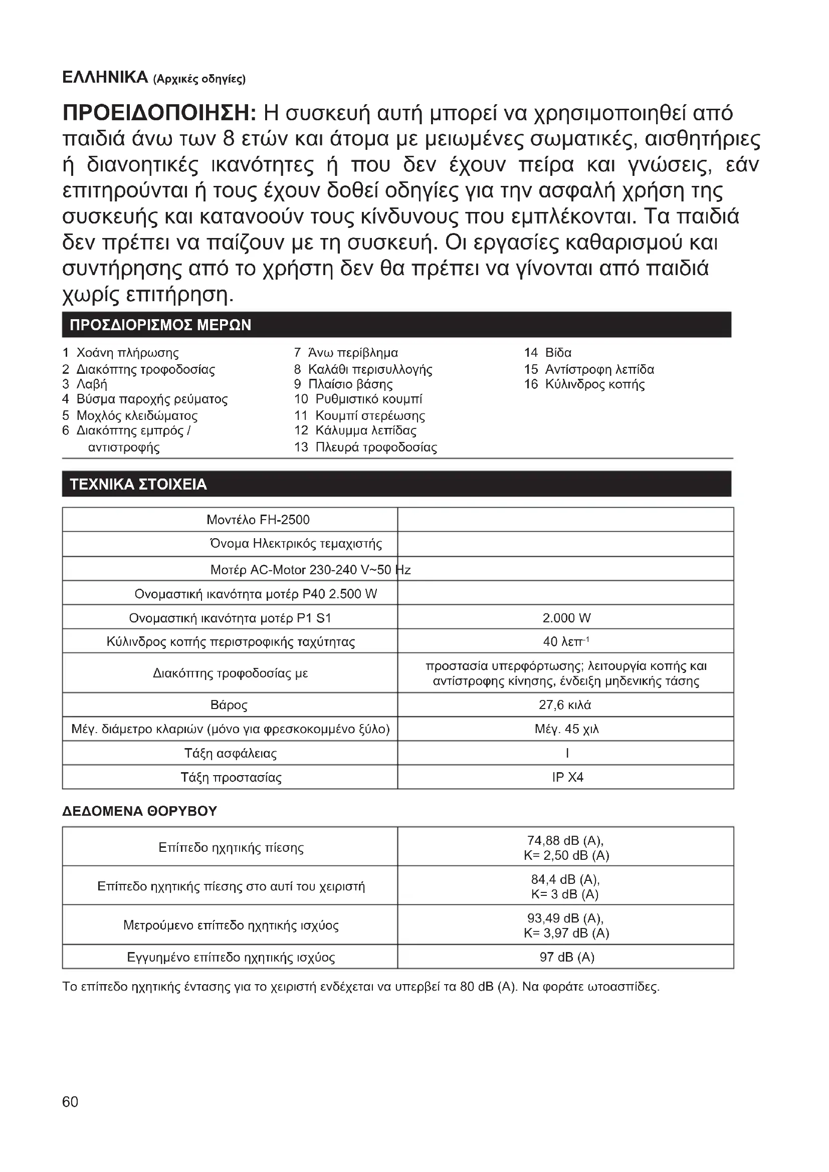 EF-KONFORMITETSERKLÆRING Kun for lande i Europa EF-konformitetserklæringen er inkluderet som Tillæg A til denne instruktionsvejledning.60 ΕΛΛΗΝΙΚΑ (Αρχικές οδηγίες) ΠΡΟΕΙΔΟΠΟΙΗΣΗ: Η συσκευή αυτή μπορεί να χρησιμοποιηθεί από παιδιά άνω των 8 ετών και άτομα με μειωμένες σωματικές, αισθητήριες ή διανοητικές ικανότητες ή που δεν έχουν πείρα και γνώσεις, εάν επιτηρούνται ή τους έχουν δοθεί οδηγίες για την ασφαλή χρήση της συσκευής και κατανοούν τους κίνδυνους που εμπλέκονται. Τα παιδιά δεν πρέπει να παίζουν με τη συσκευή. Οι εργασίες καθαρισμού και συντήρησης από το χρήστη δεν θα πρέπει να γίνονται από παιδιά χωρίς επιτήρηση. ΠΡΟΣΔΙΟΡΙΣΜΟΣ ΜΕΡΩΝ 1 Χοάνη πλήρωσης 2 Διακόπτης τροφοδοσίας 3 Λαβή 4 Βύσμα παροχής ρεύματος 5 Μοχλός κλειδώματος 6 Διακόπτης εμπρός / αντιστροφής 7 Άνω περίβλημα 8 Καλάθι περισυλλογής 9 Πλαίσιο βάσης 10 Ρυθμιστικό κουμπί 11 Κουμπί στερέωσης 12 Κάλυμμα λεπίδας 13 Πλευρά τροφοδοσίας 14 Βίδα 15 Αντίστροφη λεπίδα 16 Κύλινδρος κοπής ΤΕΧΝΙΚΑ ΣΤΟΙΧΕΙΑ Μοντέλο FH-2500 Όνομα Ηλεκτρικός τεμαχιστής Μοτέρ AC-Motor 230-240 V~50 Hz Ονομαστική ικανότητα μοτέρ P40 2.500 W Ονομαστική ικανότητα μοτέρ P1 S1 2.000 W Κύλινδρος κοπής περιστροφικής ταχύτητας 40 λεπ