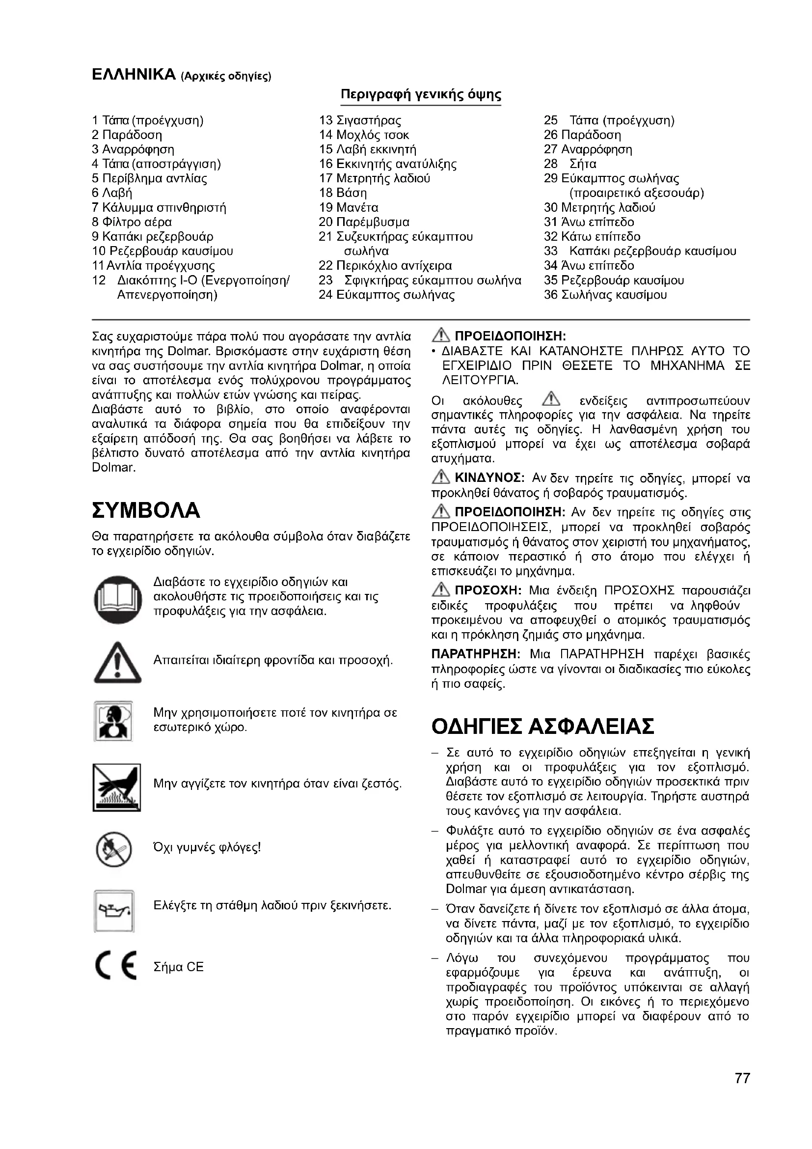 προκειμένου να αποφευχθεί ο ατομικός τραυματισμός και η πρόκληση ζημιάς στο μηχάνημα. ΠΑΡΑΤΗΡΗΣΗ: Μια ΠΑΡΑΤΗΡΗΣΗ παρέχει βασικές πληροφορίες ώστε να γίνονται οι διαδικασίες πιο εύκολες ή πιο σαφείς. ΟΔΗΓΙΕΣ ΑΣΦΑΛΕΙΑΣ – Σε αυτό το εγχειρίδιο οδηγιών επεξηγείται η γενική χρήση και οι προφυλάξεις για τον εξοπλισμό. Διαβάστε αυτό το εγχειρίδιο οδηγιών προσεκτικά πριν θέσετε τον εξοπλισμό σε λειτουργία. Τηρήστε αυστηρά τους κανόνες για την ασφάλεια. – Φυλάξτε αυτό το εγχειρίδιο οδηγιών σε ένα ασφαλές μέρος για μελλοντική αναφορά. Σε περίπτωση που χαθεί ή καταστραφεί αυτό το εγχειρίδιο οδηγιών, απευθυνθείτε σε εξουσιοδοτημένο κέντρο σέρβις της Dolmar για άμεση αντικατάσταση. – Όταν δανείζετε ή δίνετε τον εξοπλισμό σε άλλα άτομα, να δίνετε πάντα, μαζί με τον εξοπλισμό, το εγχειρίδιο οδηγιών και τα άλλα πληροφοριακά υλικά. – Λόγω του συνεχόμενου προγράμματος που εφαρμόζουμε για έρευνα και ανάπτυξη, οι προδιαγραφές του προϊόντος υπόκεινται σε αλλαγή χωρίς προειδοποίηση. Οι εικόνες ή το περιεχόμενο στο παρόν εγχειρίδιο μπορεί να διαφέρουν από το πραγματικό προϊόν. Διαβάστε το εγχειρίδιο οδηγιών και ακολουθήστε τις προειδοποιήσεις και τις προφυλάξεις για την ασφάλεια. Απαιτείται ιδιαίτερη φροντίδα και προσοχή. Μην χρησιμοποιήσετε ποτέ τον κινητήρα σε εσωτερικό χώρο. Μην αγγίζετε τον κινητήρα όταν είναι ζεστός. Όχι γυμνές φλόγες! Ελέγξτε τη στάθμη λαδιού πριν ξεκινήσετε. Σήμα CE78 – Αν χρειάζεστε οποιαδήποτε βοήθεια για περισσότερες λεπτομέρειες, ρωτήστε τον τοπικό σας αντιπρόσωπο ή εξουσιοδοτημένο κέντρο σέρβις της Dolmar. Προοριζόμενη χρήση του μηχανήματος Αυτός ο εξοπλισμός προορίζεται μόνο για το πότισμα και την άρδευση νερού. Αυτός ο εξοπλισμός χρησιμοποιείται μόνο για την άντληση καθαρού νερού.