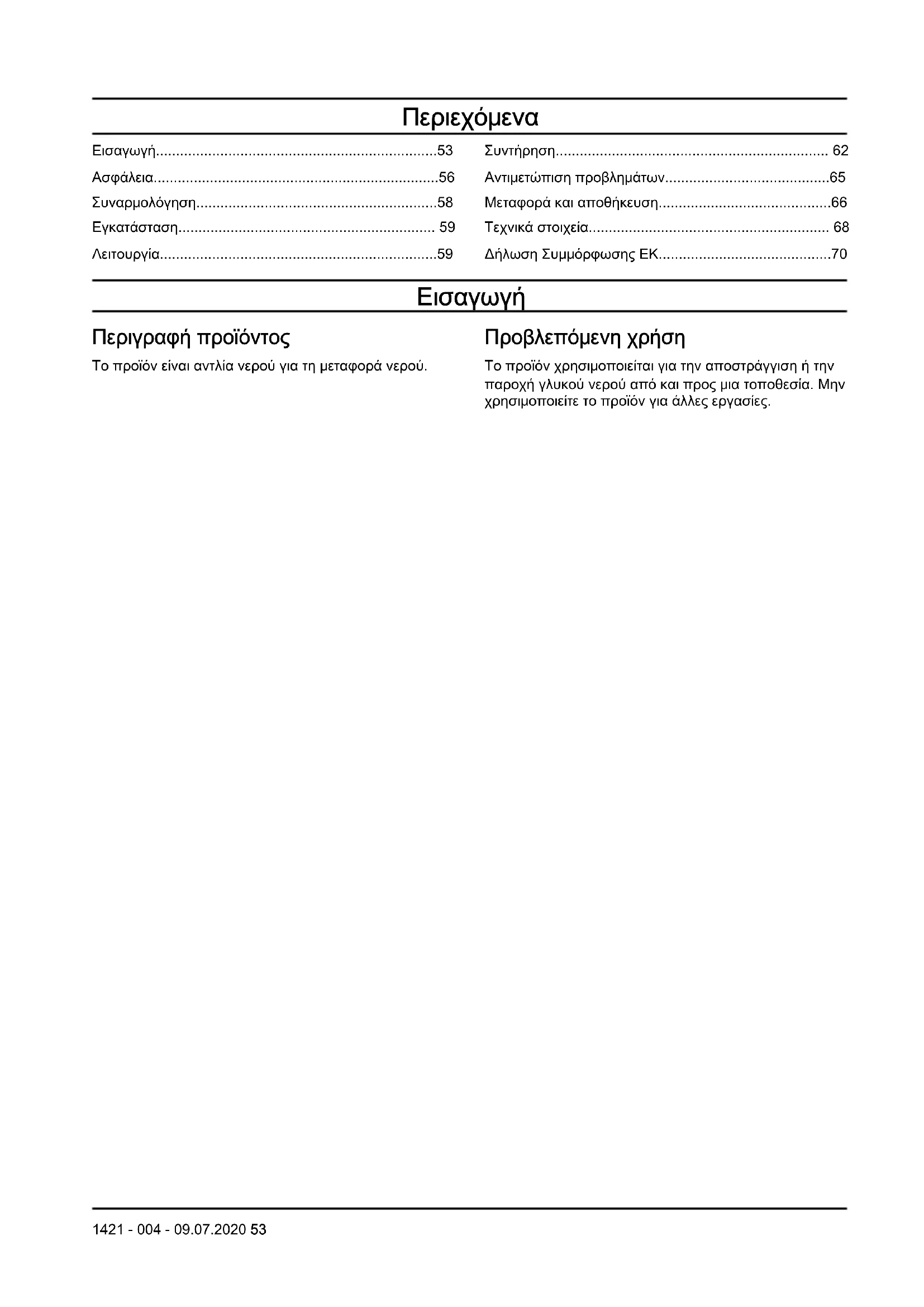 Περιγραφή προϊόντος Το προϊόν είναι αντλία νερού για τη μεταφορά νερού. Προβλεπόμενη χρήση Το προϊόν χρησιμοποιείται για την αποστράγγιση ή την παροχή γλυκού νερού από και προς μια τοποθεσία. Μην χρησιμοποιείτε το προϊόν για άλλες εργασίες. 1421 - 004 - 09.07.2020 53Επισκόπηση προϊόντος