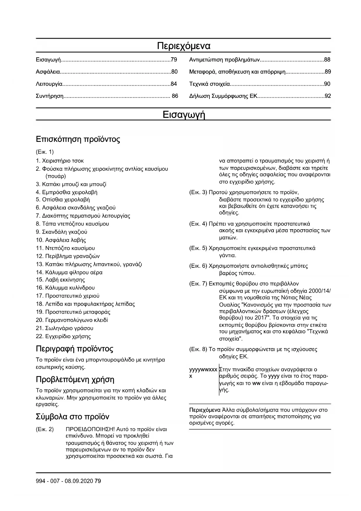 - Μην χρησιμοποιείτε ποτέ το προϊόν, εάν έχει τροποποιηθεί με οποιονδήποτε τρόπο από τις αρχικές προδιαγραφές του. Οδηγίες ασφαλείας για τη λειτουργία ΠΡΟΕΙΔΟΠΟΙΗΣΗ: Προτού χρησιμοποιήσετε το προϊόν, διαβάστε τις παρακάτω προειδοποιητικές οδηγίες. 80 994 - 007 - 08.09.2020• Μην χρησιμοποιείτε ποτέ το προϊόν σε ακραίες καιρικές συνθήκες π.χ. σε δριμύ ψύχος ή σε πολύ θερμά ή/και υγρά κλίματα.