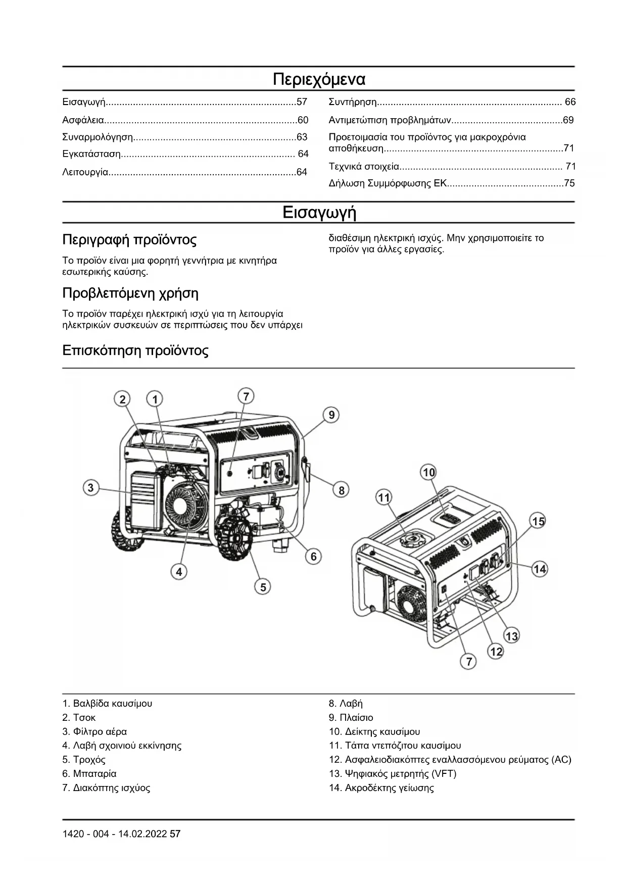 Περιγραφή προϊόντος Το προϊόν είναι μια φορητή γεννήτρια με κινητήρα εσωτερικής καύσης. Προβλεπόμενη χρήση Το προϊόν παρέχει ηλεκτρική ισχύ για τη λειτουργία ηλεκτρικών συσκευών σε περιπτώσεις που δεν υπάρχει διαθέσιμη ηλεκτρική ισχύς. Μην χρησιμοποιείτε το προϊόν για άλλες εργασίες. Επισκόπηση προϊόντος