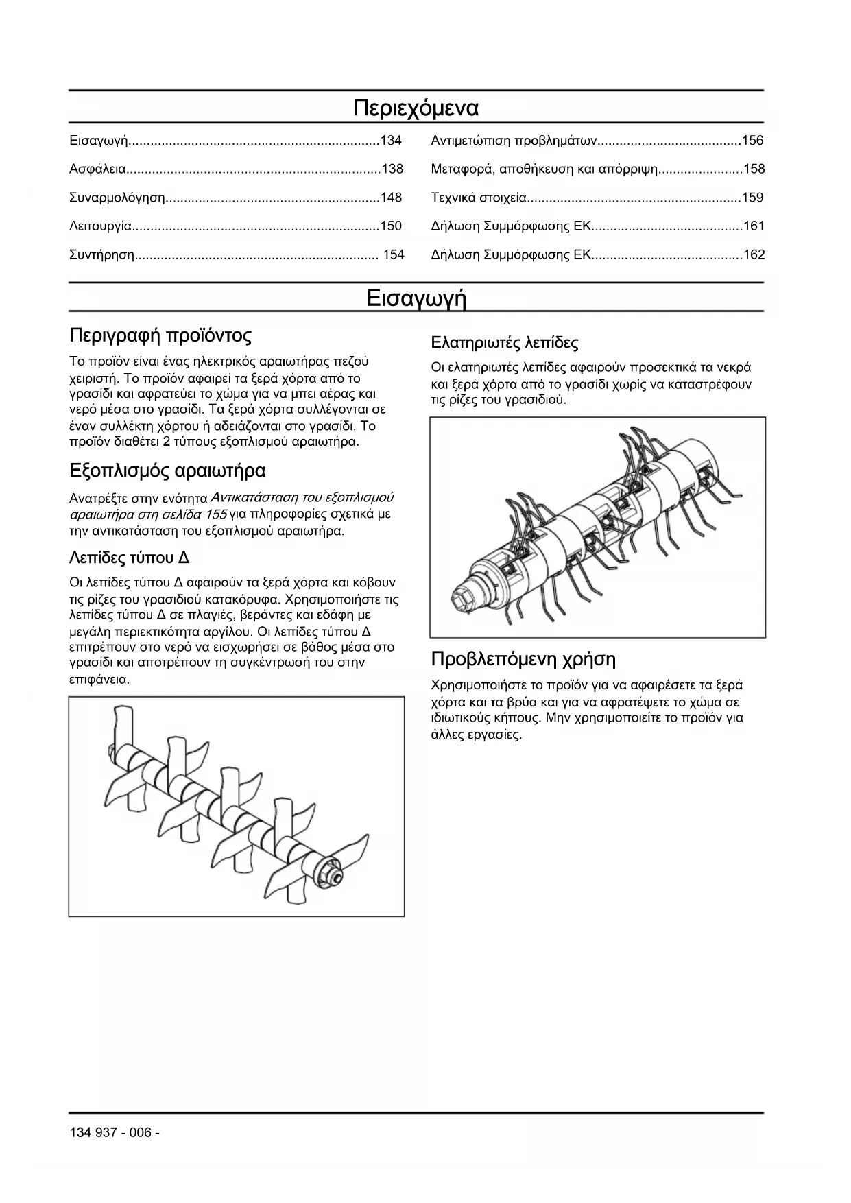 Ελατηριωτές λεπίδες Οι ελατηριωτές λεπίδες αφαιρούν προσεκτικά τα νεκρά και ξερά χόρτα από το γρασίδι χωρίς να καταστρέφουν τις ρίζες του γρασιδιού. Προβλεπόμενη χρήση Χρησιμοποιήστε το προϊόν για να αφαιρέσετε τα ξερά χόρτα και τα βρύα και για να αφρατέψετε το χώμα σε ιδιωτικούς κήπους. Μην χρησιμοποιείτε το προϊόν για άλλες εργασίες. 134 937 - 006 -Επισκόπηση προϊόντος του μοντέλου S 138i