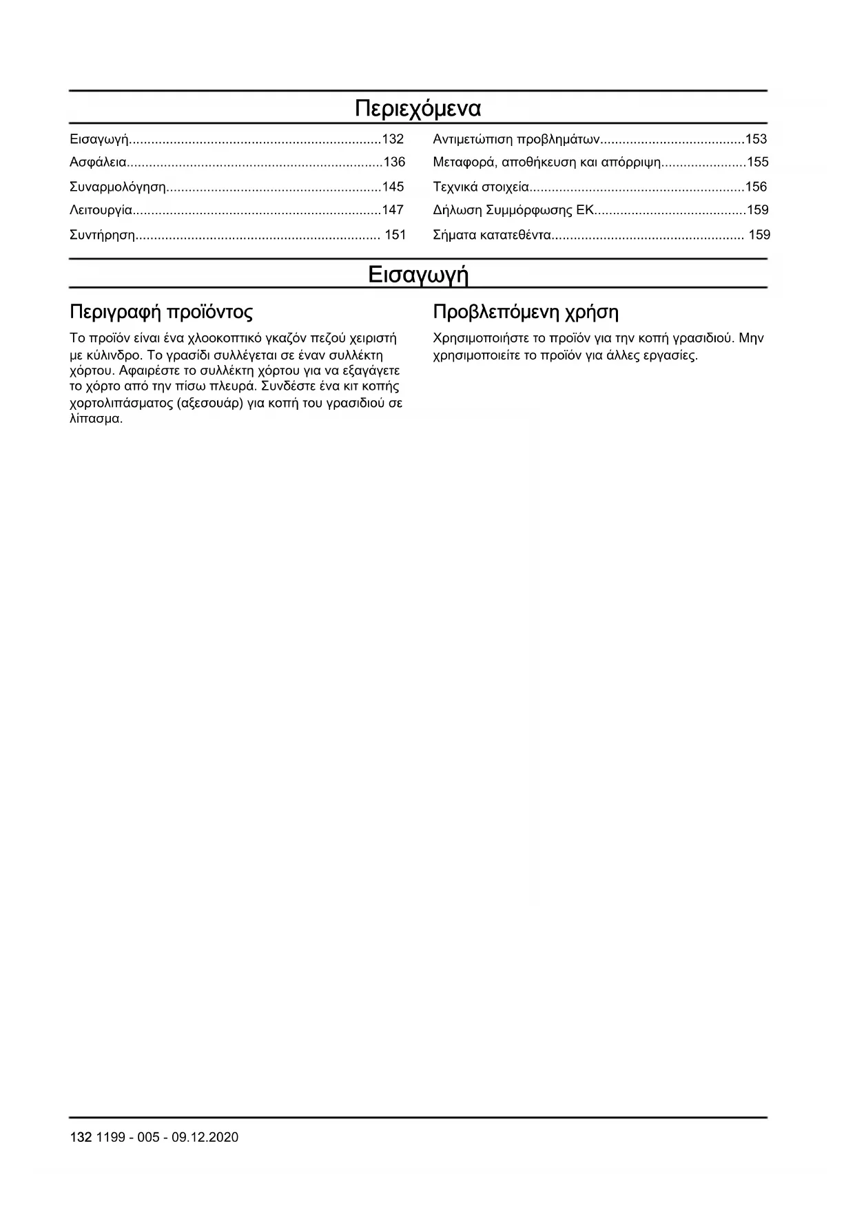 Προβλεπόμενη χρήση Χρησιμοποιήστε το προϊόν για την κοπή γρασιδιού. Μην χρησιμοποιείτε το προϊόν για άλλες εργασίες. 132 1199 - 005 - 09.12.2020Επισκόπηση προϊόντος