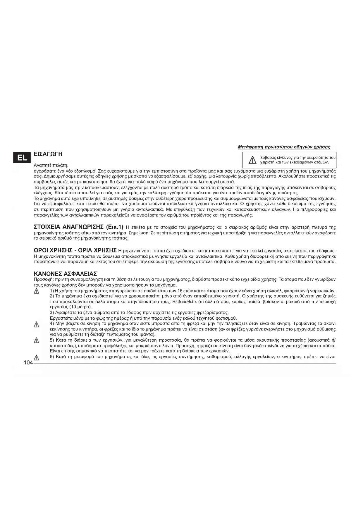 Σοβαρός κίνδυνος για την ακεραιότητα του χειριστή και των εκτεθειμένων ατόμων. Μετάφραση πρωτοτύπου οδηγιών χρήσης105