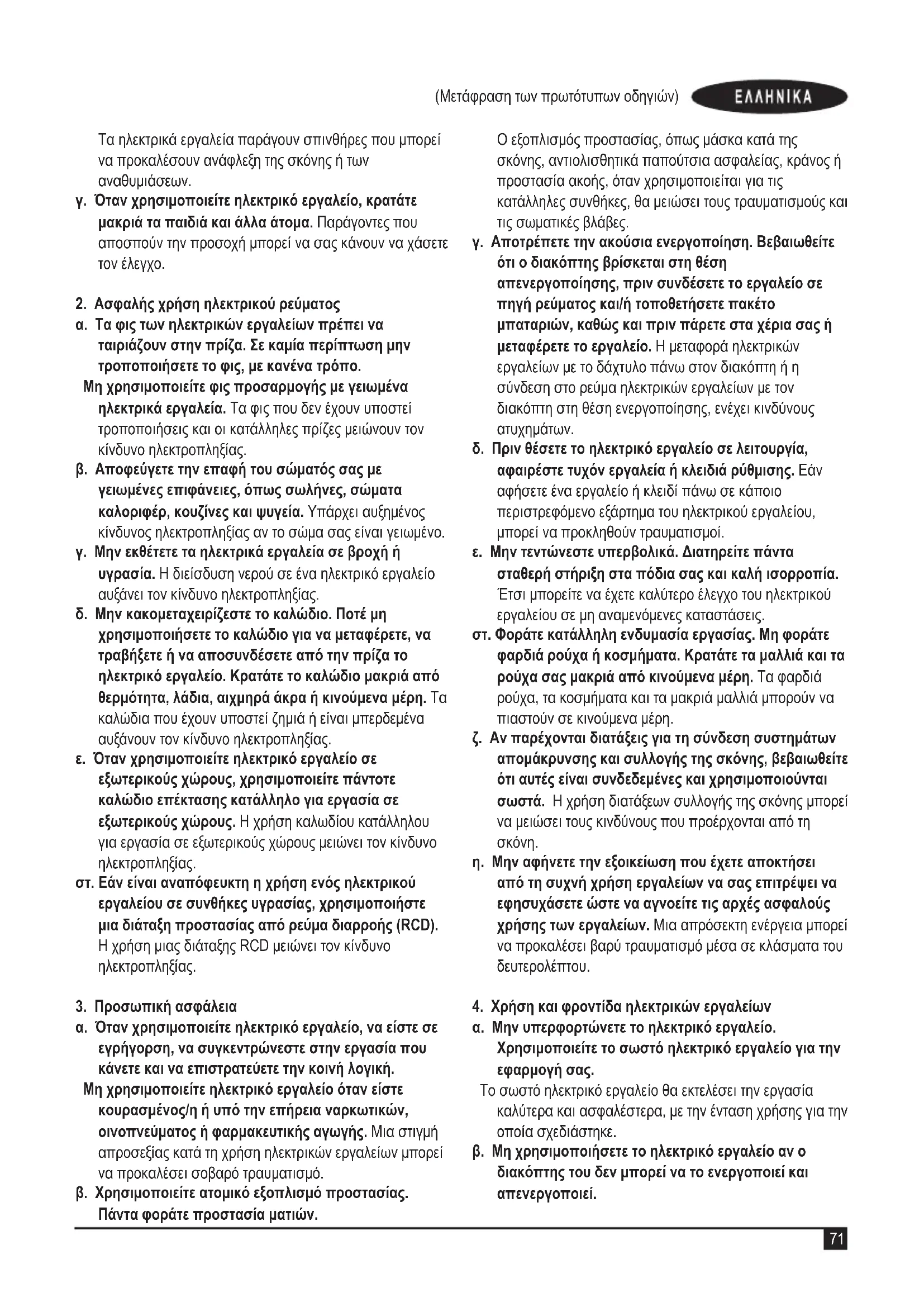 α. Μην υπερφορτώνετε το ηλεκτρικό εργαλείο. Χρησιμοποιείτε το σωστό ηλεκτρικό εργαλείο για την εφαρμογή σας. Το σωστό ηλεκτρικό εργαλείο θα εκτελέσει την εργασία καλύτερα και ασφαλέστερα, με την ένταση χρήσης για την οποία σχεδιάστηκε. β. Μη χρησιμοποιήσετε το ηλεκτρικό εργαλείο αν ο διακόπτης του δεν μπορεί να το ενεργοποιεί και απενεργοποιεί.72 (Μετάφραση των πρωτότυπων οδηγιών) Οποιοδήποτε ηλεκτρικό εργαλείο του οποίου η λειτουργία δεν μπορεί να ελεγχθεί με τον διακόπτη είναι επικίνδυνο και πρέπει να επισκευαστεί. γ. Αποσυνδέστε το φις από την πηγή ρεύματος και/ή αφαιρέστε το πακέτο μπαταριών, αν είναι αποσπώμενο, από το ηλεκτρικό εργαλείο, πριν πραγματοποιήσετε οποιεσδήποτε ρυθμίσεις, αλλάξετε αξεσουάρ ή αποθηκεύσετε ηλεκτρικά εργαλεία. Τέτοια προληπτικά μέτρα ασφαλείας μειώνουν το κίνδυνο αθέλητης εκκίνησης του ηλεκτρικού εργαλείου. δ. Φυλάσσετε μακριά από παιδιά τα ηλεκτρικά εργαλεία που δεν χρησιμοποιείτε. Μην αφήνετε να χρησιμοποιήσουν το ηλεκτρικό εργαλείο άτομα που δεν είναι εξοικειωμένα με αυτό ή άτομα που δεν έχουν διαβάσει αυτές τις οδηγίες χρήσης. Τα ηλεκτρικά εργαλεία είναι επικίνδυνα στα χέρια μη εκπαιδευμένων χρηστών. ε. Συντηρείτε τα ηλεκτρικά εργαλεία και τα αξεσουάρ. Ελέγχετε για προβλήματα ευθυγράμμισης ή για μάγκωμα των κινούμενων εξαρτημάτων, θραύση εξαρτημάτων, καθώς και για οποιοδήποτε άλλο πρόβλημα μπορεί να επηρεάσει τη λειτουργία των ηλεκτρικών εργαλείων. Αν το ηλεκτρικό εργαλείο έχει υποστεί ζημιά, παραδώστε το για επισκευή πριν το χρησιμοποιήσετε. Η ανεπαρκής συντήρηση των ηλεκτρικών εργαλείων αποτελεί αιτία πολλών ατυχημάτων. στ. Διατηρείτε τα κοπτικά εργαλεία κοφτερά και καθαρά. Τα κοπτικά εργαλεία με κοφτερές κοπτικές αιχμές που συντηρούνται σωστά έχουν λιγότερες πιθανότητες να μαγκώσουν και ελέγχονται ευκολότερα. ζ. Χρησιμοποιείτε το ηλεκτρικό εργαλείο, τα αξεσουάρ και τα εξαρτήματα εργασίας του εργαλείου κλπ. σύμφωνα με τις παρούσες οδηγίες, λαμβάνοντας υπόψη σας τις συνθήκες εργασίας και την εργασία που θέλετε να εκτελέσετε. Η χρήση του ηλεκτρικού εργαλείου για εργασίες διαφορετικές από τις προβλεπόμενες θα μπορούσε να οδηγήσει σε επικίνδυνη κατάσταση. η. Διατηρείτε τις λαβές και τις επιφάνειες κρατήματος στεγνές, καθαρές και απαλλαγμένες από λάδι και γράσο. Οι ολισθηρές λαβές και επιφάνειες κρατήματος δεν επιτρέπουν τον ασφαλή χειρισμό και έλεγχο του εργαλείου σε μη αναμενόμενες καταστάσεις.