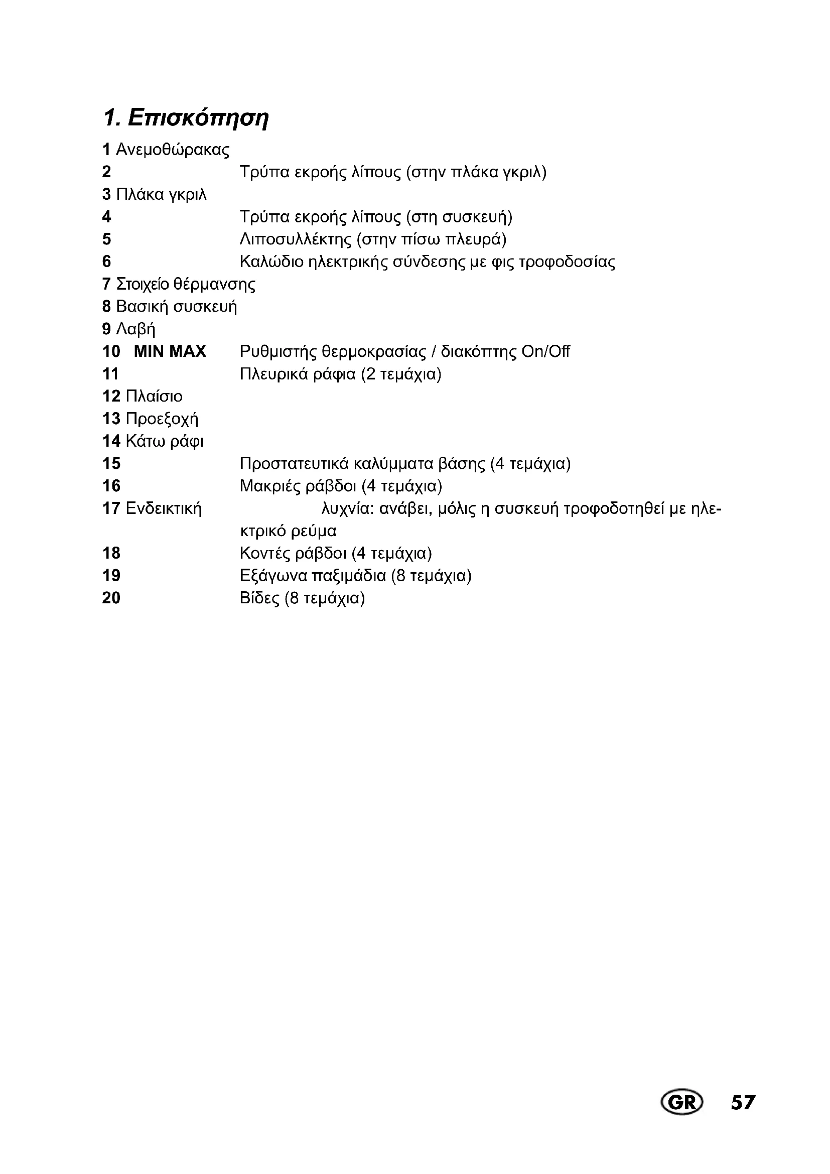 1 Ανεμοθώρακας 2 Τρύπα εκροής λίπους (στην πλάκα γκριλ) 3 Πλάκα γκριλ 4 Τρύπα εκροής λίπους (στη συσκευή) 5 Λιποσυλλέκτης (στην πίσω πλευρά) 6 Καλώδιο ηλεκτρικής σύνδεσης με φις τροφοδοσίας 7 Στοιχείο θέρμανσης 8 Βασική συσκευή 9 Λαβή 10 MIN MAX Ρυθμιστής θερμοκρασίας / διακόπτης On/Off 11 Πλευρικά ράφια (2 τεμάχια) 12 Πλαίσιο 13 Προεξοχή 14 Κάτω ράφι 15 Προστατευτικά καλύμματα βάσης (4 τεμάχια) 16 Μακριές ράβδοι (4 τεμάχια) 17 Ενδεικτική