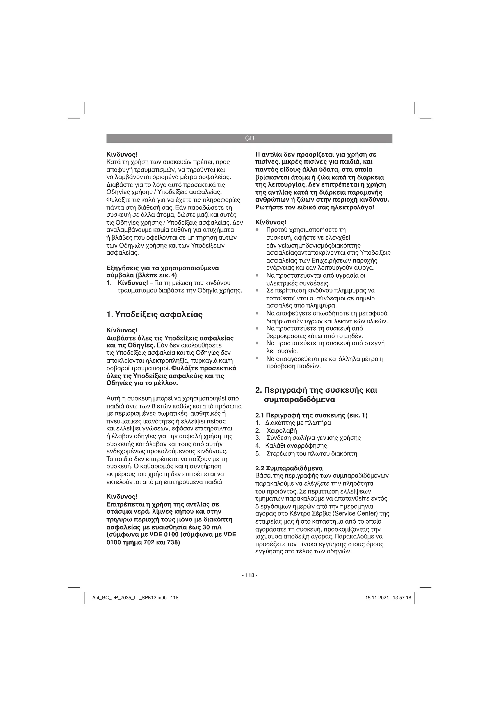 Βάσει της περιγραφής των συμπαραδιδόμενων παρακαλούμε να ελέγξετε την πληρότητα του προϊόντος. Σε περίπτωση ελλείψεων τμημάτων παρακαλούμε να αποτανθείτε εντός 5 εργάσιμων ημερών από την ημερομηνία αγοράς στο Κέντρο Σέρβις (Service Center) της εταιρείας μας ή στο κατάστημα από το οποίο αγοράσατε τη συσκευή, προσκομίζοντας την ισχύουσα απόδειξη αγοράς. Παρακαλούμε να προσέξετε τον πίνακα εγγύησης στους όρους εγγύησης στο τέλος των οδηγιών. Anl_GC_DP_7035_LL_SPK13.indb 118Anl_GC_DP_7035_LL_SPK13.indb 118 15.11.2021 13:57:1815.11.2021 13:57:18GR