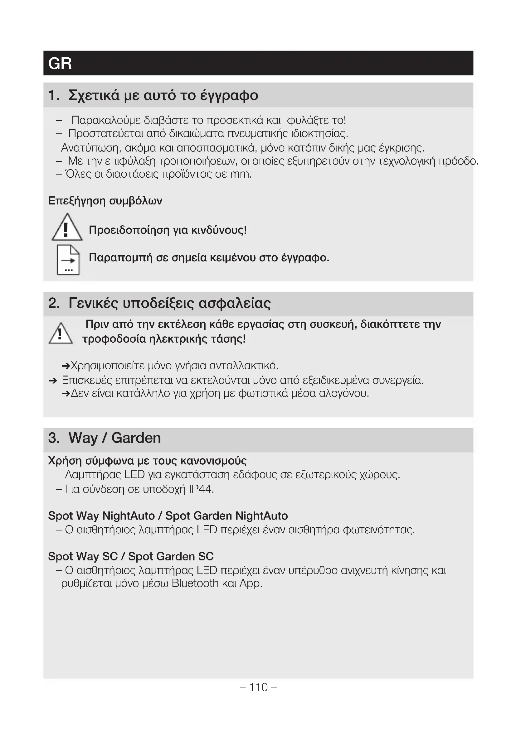 Χρήση σύμφωνα με τους κανονισμούς – Λαμπτήρας LED για εγκατάσταση εδάφους σε εξωτερικούς χώρους. – Για σύνδεση σε υποδοχή IP44. Spot Way NightAuto/Spot Garden NightAuto – Ο αισθητήριος λαμπτήρας LED περιέχει έναν αισθητήρα φωτεινότητας. Spot Way SC/Spot Garden SC – Ο αισθητήριος λαμπτήρας LED περιέχει έναν υπέρυθρο ανιχνευτή κίνησης και ρυθμίζεται μόνο μέσω Bluetooth και App.– 111 – Χρήση όχι σύμφωνα με τους κανονισμούς – Ο προβολέας LED δεν διαθέτει ρεοστατική ρύθμιση. Χωρίς ρεοστατική