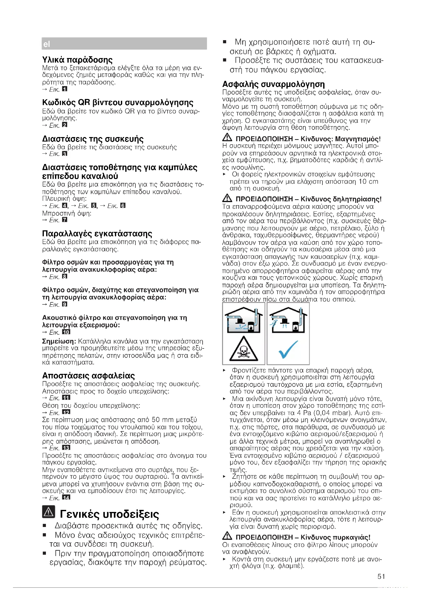 Γενικές υποδείξεις ¡ Διαβάστε προσεκτικά αυτές τις οδηγίες. ¡ Μόνο ένας αδειούχος τεχνικός επιτρέπε- ται να συνδέσει τη συσκευή. ¡ Πριν την πραγματοποίηση οποιασδήποτε εργασίας, διακόψτε την παροχή ρεύματος. ¡ Μη χρησιμοποιήσετε ποτέ αυτή τη συ- σκευή σε βάρκες ή οχήματα. ¡ Προσέξτε τις συστάσεις του κατασκευα- στή του πάγκου εργασίας. Ασφαλής συναρμολόγηση Προσέξτε αυτές τις υποδείξεις ασφαλείας, όταν συ- ναρμολογείτε τη συσκευή. Μόνο με τη σωστή τοποθέτηση σύμφωνα με τις οδη- γίες τοποθέτησης διασφαλίζεται η ασφάλεια κατά τη χρήση. Ο εγκαταστάτης είναι υπεύθυνος για την άψογη λειτουργία στη θέση τοποθέτησης. ΠΡΟΕΙΔΟΠΟΙΗΣΗ‒Κίνδυνος: Μαγνητισμός! Η συσκευή περιέχει μόνιμους μαγνήτες. Αυτοί μπο- ρούν να επηρεάσουν αρνητικά τα ηλεκτρονικά στοι- χεία εμφύτευσης, π.χ. βηματοδότες καρδιάς ή αντλί- ες ινσουλίνης. ▶ Οι φορείς ηλεκτρονικών στοιχείων εμφύτευσης πρέπει να τηρούν μια ελάχιστη απόσταση 10 cm από τη συσκευή. ΠΡΟΕΙΔΟΠΟΙΗΣΗ‒Κίνδυνος δηλητηρίασης! Τα επαναρροφούμενα αέρια καύσης μπορούν να προκαλέσουν δηλητηριάσεις. Εστίες, εξαρτημένες από τον αέρα του περιβάλλοντος (π.χ. συσκευές θέρ- μανσης που λειτουργούν με αέριο, πετρέλαιο, ξύλο ή άνθρακα, ταχυθερμοσίφωνες, θερμαντήρες νερού) λαμβάνουν τον αέρα για καύση από τον χώρο τοπο- θέτησης και οδηγούν τα καυσαέρια μέσα από μια εγκατάσταση απαγωγής των καυσαερίων (π.χ. καμι- νάδα) στον έξω χώρο. Σε συνδυασμό με έναν ενεργο- ποιημένο απορροφητήρα αφαιρείται αέρας από την κουζίνα και τους γειτονικούς χώρους. Χωρίς επαρκή παροχή αέρα δημιουργείται μια υποπίεση. Τα δηλητη- ριώδη αέρια από την καμινάδα ή τον απορροφητήρα επιστρέφουν πίσω στα δωμάτια του σπιτιού. ▶ Φροντίζετε πάντοτε για επαρκή παροχή αέρα, όταν η συσκευή χρησιμοποιείται στη λειτουργία εξαερισμού ταυτόχρονα με μια εστία, εξαρτημένη από τον αέρα του περιβάλλοντος. ▶ Μια ακίνδυνη λειτουργία είναι δυνατή μόνο τότε, όταν η υποπίεση στον χώρο τοποθέτησης της εστί- ας δεν υπερβαίνει τα 4 Pa (0,04 mbar). Αυτό επι- τυγχάνεται, όταν μέσω μη κλεινόμενων ανοιγμάτων, π.χ. στις πόρτες, στα παράθυρα, σε συνδυασμό με ένα εντοιχιζόμενο κιβώτιο αερισμού/εξαερισμού ή με άλλα τεχνικά μέτρα, μπορεί να αναπληρωθεί ο απαραίτητος αέρας που χρειάζεται για την καύση. Ένα εντοιχισμένο κιβώτιο αερισμού / εξαερισμού μόνο του, δεν εξασφαλίζει την τήρηση της οριακής