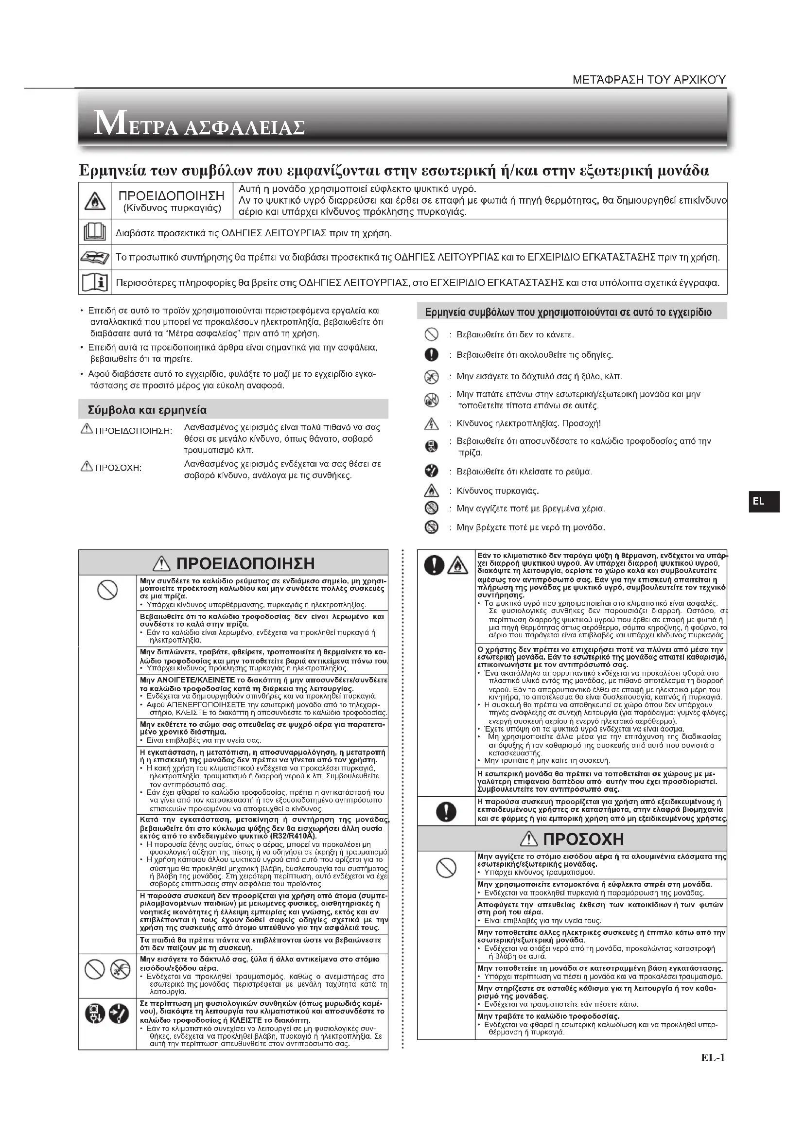 - Επειδή σε αυτό το προϊόν χρησιμοποιούνται περιστρεφόμενα εργαλεία και ανταλλακτικά που μπορεί να προκαλέσουν ηλεκτροπληξία, βεβαιωθείτε ότι διαβάσατε αυτά τα “Μέτρα ασφαλείας” πριν από τη χρήση.• Επειδή αυτά τα προειδοποιητικά άρθρα είναι σημαντικά για την ασφάλεια, βεβαιωθείτε ότι τα τηρείτε.• Αφού διαβάσετε αυτό το εγχειρίδιο, φυλάξτε το μαζί με το εγχειρίδιο εγκα-τάστασης σε προσιτό μέρος για εύκολη αναφορά. Σύμβολα και ερμηνεία ΠΡΟΕΙΔΟΠΟΙΗΣΗ:Λανθασμένος χειρισμός είναι πολύ πιθανό να σας θέσει σε μεγάλο κίνδυνο, όπως θάνατο, σοβαρό τραυματισμό κλπ. ΠΡΟΣΟΧΗ:Λανθασμένος χειρισμός ενδέχεται να σας θέσει σε σοβαρό κίνδυνο, ανάλογα με τις συνθήκες. Ερμηνεία συμβόλων που χρησιμοποιούνται σε αυτό το εγχειρίδιο : Βεβαιωθείτε ότι δεν το κάνετε. : Βεβαιωθείτε ότι ακολουθείτε τις οδηγίες. : Μην εισάγετε το δάχτυλό σας ή ξύλο, κλπ. : Μην πατάτε επάνω στην εσωτερική/εξωτερική μονάδα και μην τοποθετείτε τίποτα επάνω σε αυτές. : Κίνδυνος ηλεκτροπληξίας. Προσοχή! : Βεβαιωθείτε ότι αποσυνδέσατε το καλώδιο τροφοδοσίας από την πρίζα. : Βεβαιωθείτε ότι κλείσατε το ρεύμα. : Κίνδυνος πυρκαγιάς. : Μην αγγίζετε ποτέ με βρεγμένα χέρια. : Μην βρέχετε ποτέ με νερό τη μονάδα. ΜΕΤΡΑ ΑΣΦΑΛΕΙΑΣ Ερμηνεία των συμβόλων που εμφανίζονται στην εσωτερική ή/και στην εξωτερική μονάδα ΠΡΟΕΙΔΟΠΟΙΗΣΗ (Κίνδυνος πυρκαγιάς)Αυτή η μονάδα χρησιμοποιεί εύφλεκτο ψυκτικό υγρό.Αν το ψυκτικό υγρό διαρρεύσει και έρθει σε επαφή με φωτιά ή πηγή θερμότητας, θα δημιουργηθεί επικίνδυνο αέριο και υπάρχει κίνδυνος πρόκλησης πυρκαγιάς.Διαβάστε προσεκτικά τις ΟΔΗΓΙΕΣ ΛΕΙΤΟΥΡΓΙΑΣ πριν τη χρήση. Το προσωπικό συντήρησης θα πρέπει να διαβάσει προσεκτικά τις ΟΔΗΓΙΕΣ ΛΕΙΤΟΥΡΓΙΑΣ και το ΕΓΧΕΙΡΙΔΙΟ ΕΓΚΑΤΑΣΤΑΣΗΣ πριν τη χρήση. Περισσότερες πληροφορίες θα βρείτε στις ΟΔΗΓΙΕΣ ΛΕΙΤΟΥΡΓΙΑΣ, στο ΕΓΧΕΙΡΙΔΙΟ ΕΓΚΑΤΑΣΤΑΣΗΣ και στα υπόλοιπα σχετικά έγγραφα. ΠΡΟΕΙΔΟΠΟΙΗΣΗ Μην συνδέετε το καλώδιο ρεύματος σε ενδιάμεσο σημείο, μη χρησι-μοποιείτε προέκταση καλωδίου και μην συνδέετε πολλές συσκευές σε μια πρίζα.• Υπάρχει κίνδυνος υπερθέρμανσης, πυρκαγιάς ή ηλεκτροπληξίας.Βεβαιωθείτε ότι το καλώδιο τροφοδοσίας δεν είναι λερωμένο και συνδέστε το καλά στην πρίζα.• Εάν το καλώδιο είναι λερωμένο, ενδέχεται να προκληθεί πυρκαγιά ή ηλεκτροπληξία.Μην διπλώνετε, τραβάτε, φθείρετε, τροποποιείτε ή θερμαίνετε το κα-λώδιο τροφοδοσίας και μην τοποθετείτε βαριά αντικείμενα πάνω του.• Υπάρχει κίνδυνος πρόκλησης πυρκαγιάς ή ηλεκτροπληξίας.Μην ΑΝΟΙΓΕΤΕ/ΚΛΕΙΝΕΤΕ το διακόπτη ή μην αποσυνδέετε/συνδέετε το καλώδιο τροφοδοσίας κατά τη διάρκεια της λειτουργίας.• Ενδέχεται να δημιουργηθούν σπινθήρες και να προκληθεί πυρκαγιά.• Αφού ΑΠΕΝΕΡΓΟΠΟΙΗΣΕΤΕ την εσωτερική μονάδα από το τηλεχειρι-στήριο, ΚΛΕΙΣΤΕ το διακόπτη ή αποσυνδέστε το καλώδιο τροφοδοσίας. Μην εκθέτετε το σώμα σας απευθείας σε ψυχρό αέρα για παρατετα-μένο χρονικό διάστημα.• Είναι επιβλαβές για την υγεία σας.Η εγκατάσταση, η μετατόπιση, η αποσυναρμολόγηση, η μετατροπή ή η επισκευή της μονάδας δεν πρέπει να γίνεται από τον χρήστη.• Η κακή χρήση του κλιματιστικού ενδέχεται να προκαλέσει πυρκαγιά, ηλεκτροπληξία, τραυματισμό ή διαρροή νερού κ.λπ. Συμβουλευθείτε τον αντιπρόσωπό σας.• Εάν έχει φθαρεί το καλώδιο τροφοδοσίας, πρέπει η αντικατάστασή του να γίνει από τον κατασκευαστή ή τον εξουσιοδοτημένο αντιπρόσωπο επισκευών προκειμένου να αποφευχθεί 