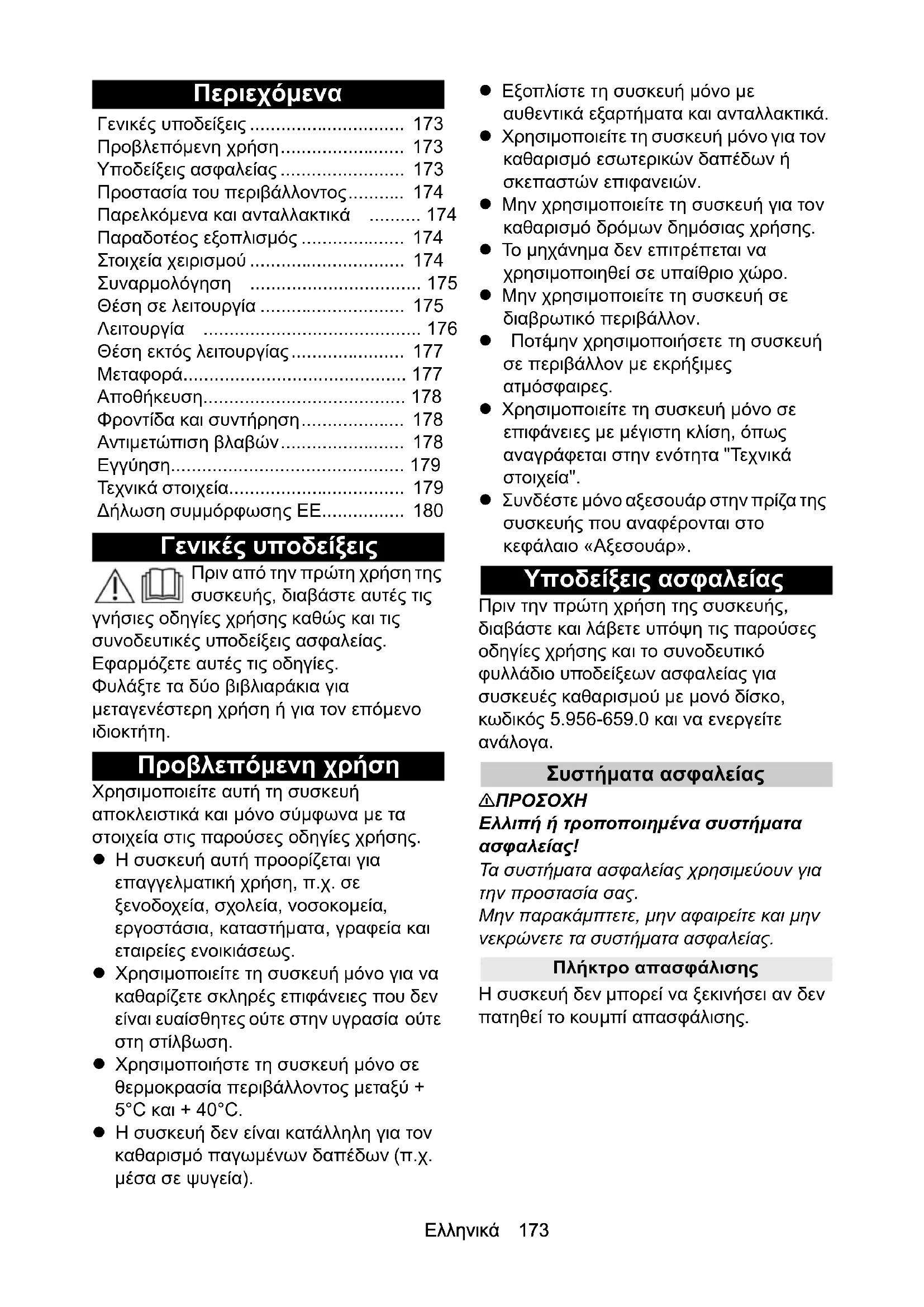 στη στίλβωση. Χρησιμοποιήστε τη συσκευή μόνο σε θερμοκρασία περιβάλλοντος μεταξύ + 5°C και + 40°C. Η συσκευή δεν είναι κατάλληλη για τον καθαρισμό παγωμένων δαπέδων (π.χ. μέσα σε ψυγεία). Εξοπλίστε τη συσκευή μόνο με αυθεντικά εξαρτήματα και ανταλλακτικά. Χρησιμοποιείτε τη συσκευή μόνο για τον καθαρισμό εσωτερικών δαπέδων ή σκεπαστών επιφανειών. Μην χρησιμοποιείτε τη συσκευή για τον καθαρισμό δρόμων δημόσιας χρήσης. Το μηχάνημα δεν επιτρέπεται να χρησιμοποιηθεί σε υπαίθριο χώρο. Μην χρησιμοποιείτε τη συσκευή σε διαβρωτικό περιβάλλον.