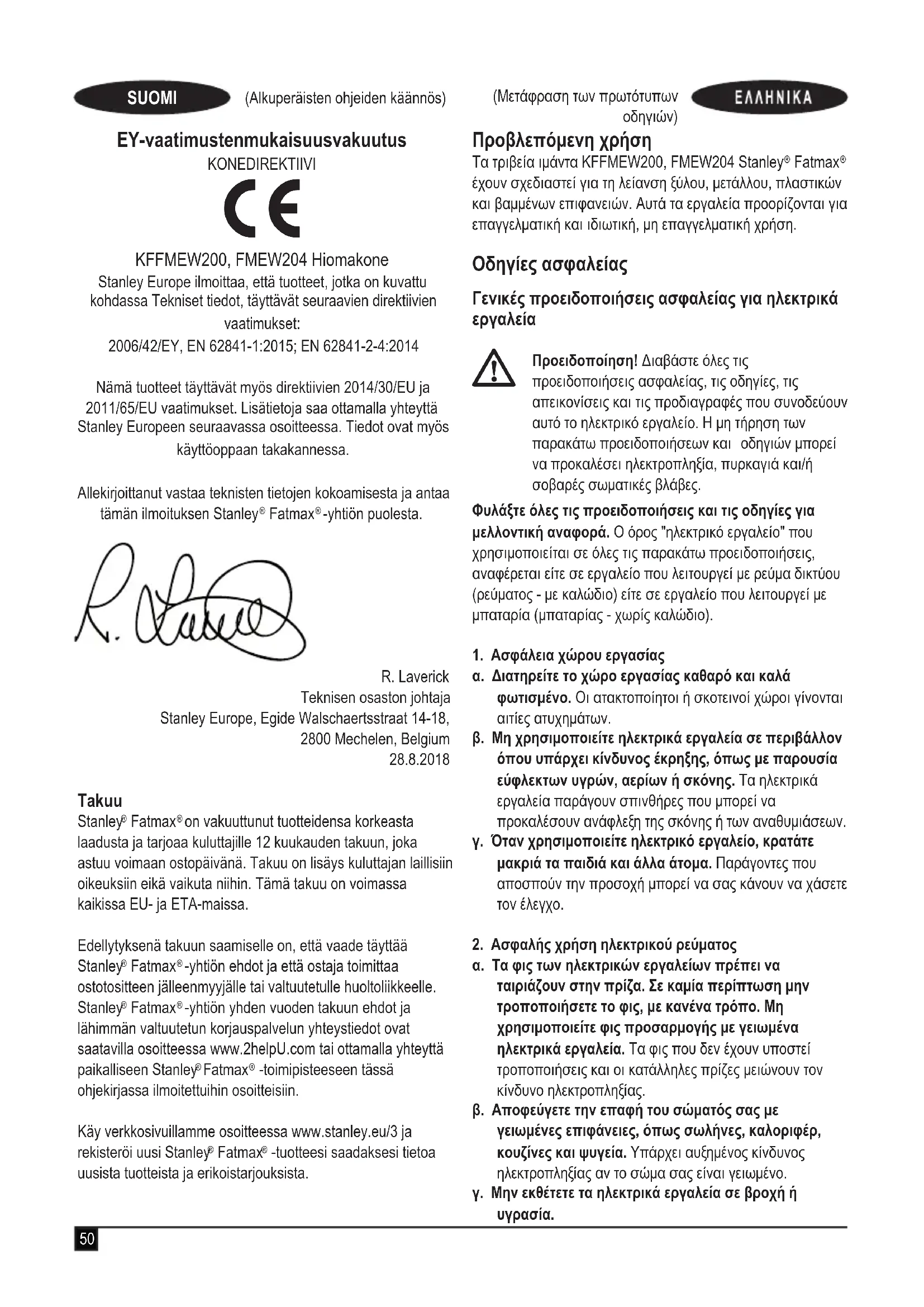 KFFMEW200, FMEW204 Τριβείο ιμάντα Η Stanley Europe δηλώνει ότι αυτά τα προϊόντα που περιγράφονται στα "τεχνικά δεδομένα" συμμορφώνονται με: 2006/42/EC, EN 62841-1:2015; EN 62841-2-4:201455 (Μετάφραση των πρωτότυπων