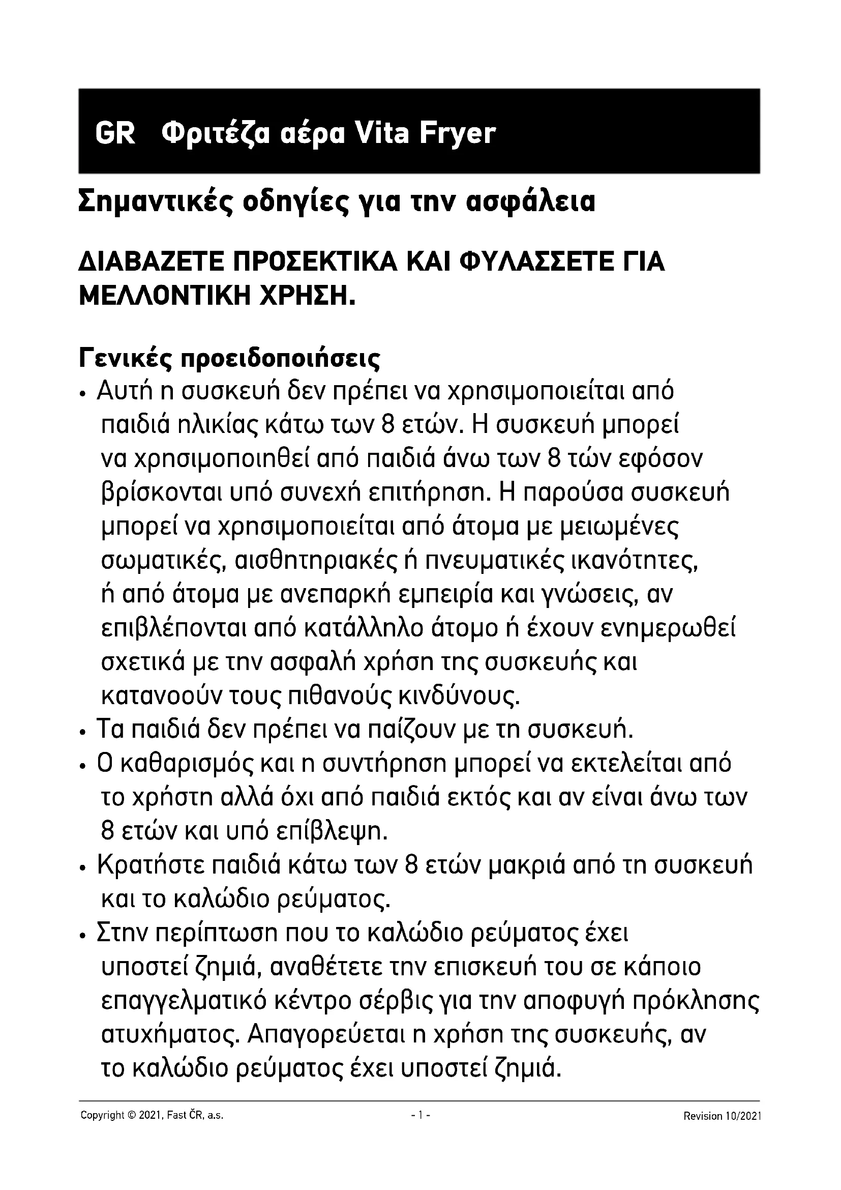 - Στην περίπτωση που το καλώδιο ρεύματος έχει υποστεί ζημιά, αναθέτετε την επισκευή του σε κάποιο επαγγελματικό κέντρο σέρβις για την αποφυγή πρόκλησης ατυχήματος. Απαγορεύεται η χρήση της συσκευής, αν το καλώδιο ρεύματος έχει υποστεί ζημιά.- 2 - Revision 10/2021 Copyright © 2021, Fast ČR, a.s.