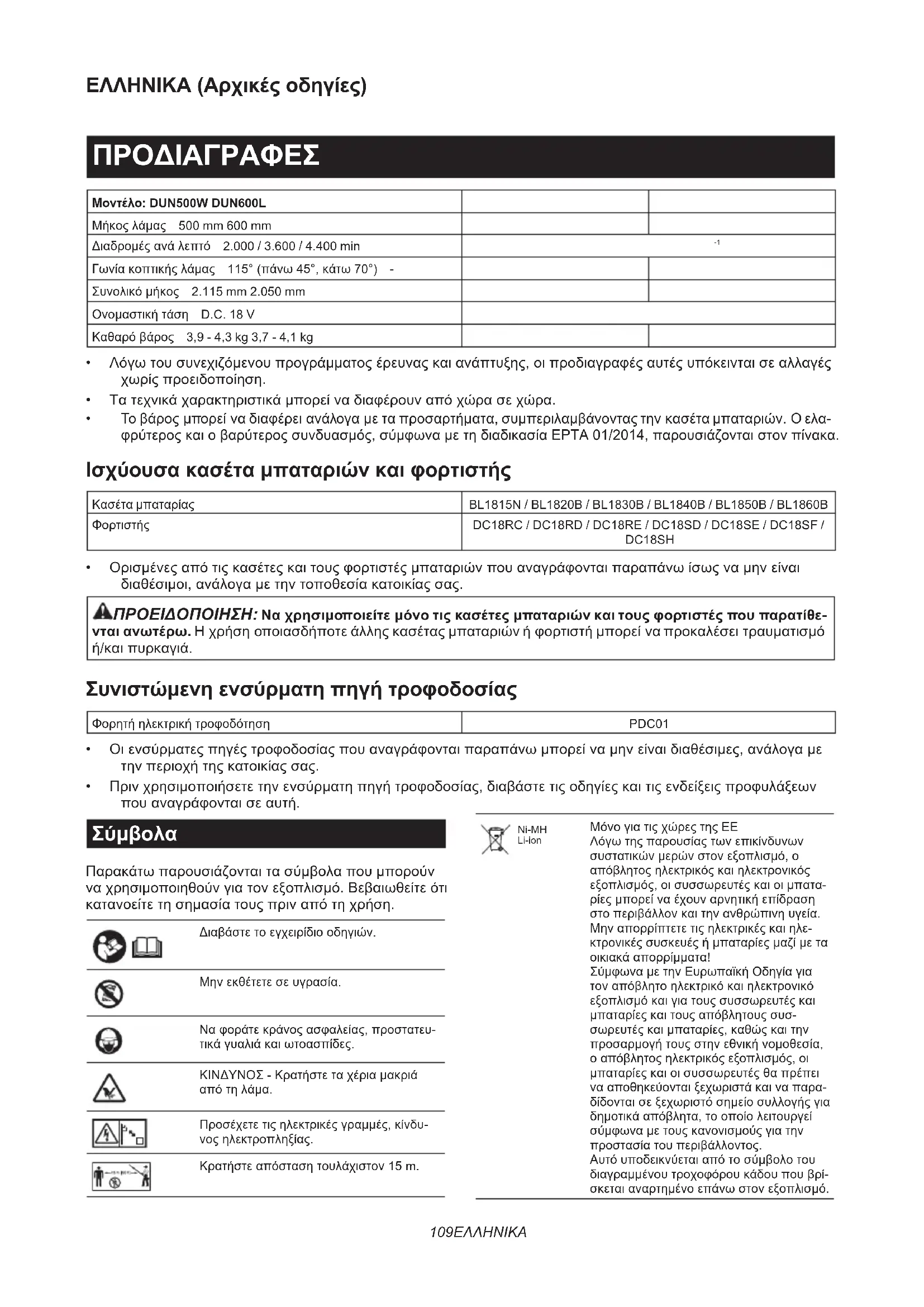 1,5 DUN600L 3,8 1,5 2,7 1,5 ΠΑΡΑΤΗΡΗΣΗ:Ηδηλωμένητιμή(ές)συνολικώνκραδασμώνέχειμετρηθείσύμφωναμετηνπρότυπημέθοδο δοκιμήςκαιμπορείναχρησιμοποιηθείγιατησύγκρισηενόςεργαλείουμεκάποιοάλλο. ΠΑΡΑΤΗΡΗΣΗ:Ηδηλωμένητιμή(ές)συνολικώνκραδασμώνμπορείναχρησιμοποιηθείκαιστηνπροκαταρκτική αξιολόγησητηςέκθεσης. ΠΡΟΕΙΔΟΠΟΙΗΣΗ: Η εκπομπή κραδασμών κατά τη χρήση του ηλεκτρικού εργαλείου σε πραγματικές συνθήκες μπορεί να διαφέρει από τη δηλωμένη τιμή(ές) εκπομπής ανάλογα με τους τρόπους χρήσης του εργαλείου, ιδιαίτερα το είδος του τεμαχίου εργασίας που υπόκειται επεξεργασία. ΠΡΟΕΙΔΟΠΟΙΗΣΗ: Φροντίστε να λάβετε τα κατάλληλα μέτρα προστασίας του χειριστή βάσει ενός υπολογισμού της έκθεσης σε πραγματικές συνθήκες χρήσης (λαμβάνοντας υπόψη όλες τις συνιστώσες του κύκλου λειτουργίας όπως τους χρόνους που το εργαλείο είναι εκτός λειτουργίας και όταν βρίσκεται σε αδρανή λειτουργία πέραν του χρόνου ενεργοποίησης). Δήλωση συμμόρφωσης ΕΚ Μόνο για χώρες της Ευρώπης ΗδήλωσησυμμόρφωσηςΕΚπεριλαμβάνεταιως ΠαράρτημαAστοπαρόνεγχειρίδιοοδηγιών.111 ΕΛΛΗΝΙΚΑ ΠΡΟΕΙΔΟΠΟΙΗΣΕΙΣ
