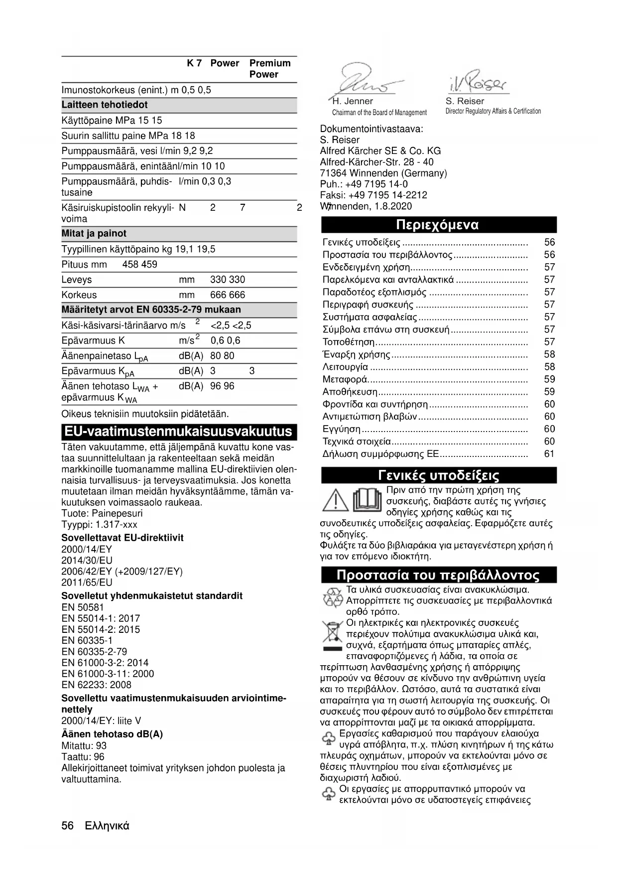 Σε κάθε χώρα ισχύουν οι όροι εγγύησης οι οποίοι εκδίδονται από την αρμόδια εταιρεία διανομής μας. Τυχόν βλάβες στη συσκευή σας επιδιορθώνονται από εμάς χωρίς χρέωση εντός της προθεσμίας εγγύησης, εφόσον οφείλονται σε σφάλμα υλικού ή κατασκευής. Σε περίπτωση εγγύησης απευθυνθείτε στον προμηθευτή σας ή το πλησιέστερο εξουσιοδοτημένο τμήμα εξυπηρέτησης πελατών, πρ οσκομίζοντας το παραστατικό της αγοράς. (για διευθύνσεις βλέπε την πίσω σελίδα) Τεχνικά στοιχεία K 7 Power Premium Power Ηλεκτρική σύνδεση Τάση V 230 230 Φάση ~1 1 Συχνότητα Hz 50 50 Μέγιστη επιτρεπτή εμπέδηση δικτύου Ω 0,394 + j0,246 0,394 + j0,246 Ισχύς σύνδεσης kW 3,0 3,0 Τύπος προστασίας IPX5 IPX5 Κατηγορία προστασίας II Ασφάλεια δικτύου (με χρονοκαθυστέρηση) A16 16Türkçe 61 Με την επιφύλαξη τεχνικών αλλαγών. Δήλωση συμμόρφωσης EΕ Με το παρόν δηλώνουμε ότι η παρακάτω μηχανή λόγω του σχεδιασμού και του τύπου κατασκευής της καθώς και στην έκδοση την οποία έχουμε διαθέσει στην αγορά πληροί τις σχετικές βασικές απαιτήσεις για την ασφάλεια και την υγεία των Οδηγιών ΕΕ. Σε περίπτωση τροποποίησης της μηχανής που δεν έχει συμφωνηθεί με εμάς, αυ τή η δήλωση ακυρώνεται. Προϊόν: Συσκευή καθαρισμού υψηλής πίεσης Τύπος: 1.317-xxx Σχετικές Οδηγίες ΕΕ 2000/14/EΚ 2014/30/EΕ 2006/42/EΚ (+2009/127/EΚ) 2011/65/EΕ Εφαρμοζόμενα εναρμονισμένα πρότυπα EN 50581 EN 55014-1: 2017 EN 55014-2: 2015 EN 60335-1 EN 60335-2-79 EN 61000-3-2: 2014 EN 61000-3-11: 2000 EN 62233: 2008 Εφαρμοζόμενη διαδικασία αξιολόγησης συμμόρφωσης 2000/14/EΚ: Παράρτημα V Στάθμη ηχητικής ισχύος dB(A) Μετρημένη: 93 Εγγυημένη: 96 Οι υπογράφοντες ενεργούν κατ’ εντολή και με πληρεξούσιο από τη διεύθυνση της εταιρείας. Πληρεξούσιος τεκμηρίωσης: S. Reiser Alfred Kärcher SE & Co. KG Alfred-Kärcher-Str. 28 - 40 71364 Winnenden (Germany) Τηλ.: +49 7195 14-0 Φαξ: +49 7195 14-2212 Winnenden, 2020/08/01 İçindekiler Genel uyarılar Cihazı ilk defa kullanmadan önce orijinal işletim kılavuzunu ve ekli güvenlik bilgi- lerini okuyun. Bu bilgilere göre hareket edin. Her iki kılavuzu daha sonra kullanmak için ve sizden sonraki kullanıcı için saklayın. Çevre koruma Paketleme malzemeleri geri dönüştürülebilir. Lütfen ambalajları çevreye zarar vermeden tasfiye edin. Elektrikli ve elektronik cihazlar, değerli ve geri dö- nüştürülebilir malzemelerin yanı sıra yanlış kulla- nılması veya yanlış tasfiye edilmesi durumunda insan sağlığı ve çevre için potansiyel tehlike teşkil edebilecek piller, aküler veya yağlar içerebilir. Ancak ci- hazın usulüne uygun şekilde çalıştırılması için bu parça- lar gereklidir. Bu simge ile işaretlenen cihazlar evsel çöp ile birlikte imha edilmemelidir. Ör. motor yıkama, alt zemin yıkama gibi yağ içerikli atık su oluşan temizlik çalışmaları sadece yağ ay- rıştırıcılı yıkama yerlerinde yapılabilir. Σύνδεση νερού Πίεση παροχής (μέγ.) MPa 1,2 1,2 Θερμοκρασία παροχής
