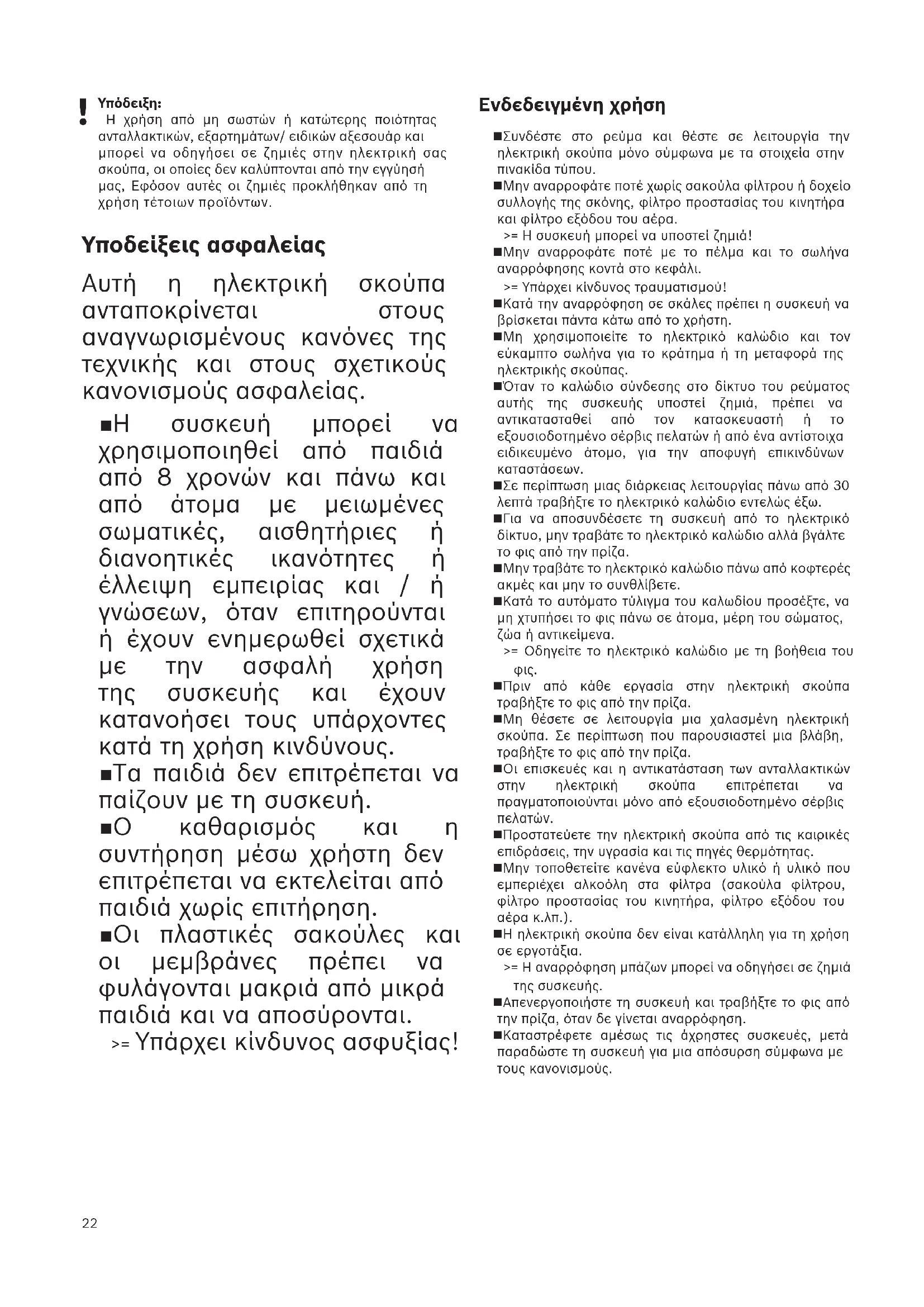 Υπόδειξη: Η χρήση από μη σωστών ή κατώτερης ποιότητας ανταλλακτικών, εξαρτημάτων/ ειδικών αξεσουάρ και μπορεί να οδηγήσει σε ζημιές στην ηλεκτρική σας σκούπα, οι οποίες δεν καλύπτονται από την εγγύησή μας, Εφόσον αυτές οι ζημιές προκλήθηκαν από τη χρήση τέτοιων προϊόντων. Υποδείξεις ασφαλείας Αυτή η ηλεκτρική σκούπα ανταποκρίνεται στους αναγνωρισµένους κανόνες της τεχνικής και στους σχετικούς κανονισµούς ασφαλείας. Η συσκευή µπορεί να χρησιµοποιηθεί από παιδιά από 8 χρονών και πάνω και από άτοµα µε µειωµένες σωµατικές, αισθητήριες ή διανοητικές ικανότητες ή έλλειψη εµπειρίας και / ή γνώσεων, όταν επιτηρούνται ή έχουν ενηµερωθεί σχετικά µε την ασφαλή χρήση της συσκευής και έχουν κατανοήσει τους υπάρχοντες κατά τη χρήση κινδύνους. Τα παιδιά δεν επιτρέπεται να παίζουν µε τη συσκευή. Ο καθαρισµός και η συντήρηση µέσω χρήστη δεν επιτρέπεται να εκτελείται από παιδιά χωρίς επιτήρηση. Οι πλαστικές σακούλες και οι µεµβράνες πρέπει να φυλάγονται µακριά από µικρά παιδιά και να αποσύρονται. >= Υπάρχει κίνδυνος ασφυξίας! Ενδεδειγµένη χρήση Συνδέστε στο ρεύµα και θέστε σε λειτουργία την ηλεκτρική σκούπα µόνο σύµφωνα µε τα στοιχεία στην πινακίδα τύπου. Μην αναρροφάτε ποτέ χωρίς σακούλα φίλτρου ή δοχείο συλλογής της σκόνης, φίλτρο προστασίας του κινητήρα και φίλτρο εξόδου του αέρα. >= Η συσκευή µπορεί να υποστεί ζηµιά! Μην αναρροφάτε ποτέ με το πέλμα και το σωλήνα αναρρόφησης κοντά στο κεφάλι.>= Υπάρχει κίνδυνος τραυµατισµού! Κατά την αναρρόφηση σε σκάλες πρέπει η συσκευή να βρίσκεται πάντα κάτω από το χρήστη. Μη χρησιµοποιείτε το ηλεκτρικό καλώδιο και τον εύκαµπτο σωλήνα για το κράτηµα ή τη µεταφορά της ηλεκτρικής σκούπας. Όταν το καλώδιο σύνδεσης στο δίκτυο του ρεύµατος αυτής της συσκευής υποστεί ζηµιά, πρέπει να αντικατασταθεί από τον κατασκευαστή ή το εξουσιοδοτηµένο σέρβις πελατών ή από ένα αντίστοιχα ειδικευµένο άτοµο, για την αποφυγή επικινδύνων καταστάσεων. Σε περίπτωση μιας διάρκειας λειτουργίας πάνω από 30 λεπτά τραβήξτε το ηλεκτρικό καλώδιο εντελώς έξω. Για να αποσυνδέσετε τη συσκευή από το ηλεκτρικό δίκτυο, µην τραβάτε το ηλεκτρικό καλώδιο αλλά βγάλτε το φις από την πρίζα. Μην τραβάτε το ηλεκτρικό καλώδιο πάνω από κοφτερές ακµές και µην το συνθλίβετε. Κατά το αυτόματο τύλιγμα του καλωδίου προσέξτε, να μη χτυπήσει το φις πάνω σε άτομα, μέρη του σώματος, ζώα ή αντικείμενα. >= Οδηγείτε το ηλεκτρικό καλώδιο με τη βοήθεια του Πριν από κάθε εργασία στην ηλεκτρική σκούπα τραβήξτε το φις από την πρίζα. Μη θέσετε σε λειτουργία µια χαλασµένη ηλεκτρική σκούπα. Σε περίπτωση που παρουσιαστεί µια βλάβη, τραβήξτε το φις από την πρίζα. Οι επισκευές και η αντικατάσταση των ανταλλακτικών στην ηλεκτρική σκούπα επιτρέπεται να πραγµατοποιούνται µόνο από εξουσιοδοτηµένο σέρβις πελατών. Προστατεύετε την ηλεκτρική σκούπα από τις καιρικές επιδράσεις, την υγρασία και τις πηγές θερµότητας. Μην τοποθετείτε κανένα εύφλεκτο υλικό ή υλικό που εµπεριέχει αλκοόλη στα φίλτρα (σακούλα φίλτρου, φίλτρο προστασίας του κινητήρα, φίλτρο εξόδου του αέρα κ.λπ.). Η ηλεκτρική σκούπα δεν είναι κατάλληλη για τη χρήση σε εργοτάξια. >= Η αναρρόφηση µπάζων µπορεί να οδηγήσει σε ζηµιά της συσκευής. Απενεργοποιήστε τη συσκευή και τραβήξτε το φις από την πρίζα, όταν δε γίνεται αναρρόφηση. Καταστρέφετε αµέσως τις άχρηστες συσκευές, µετά παραδώστε τη συσκευή για µια απόσυρση σύµφ