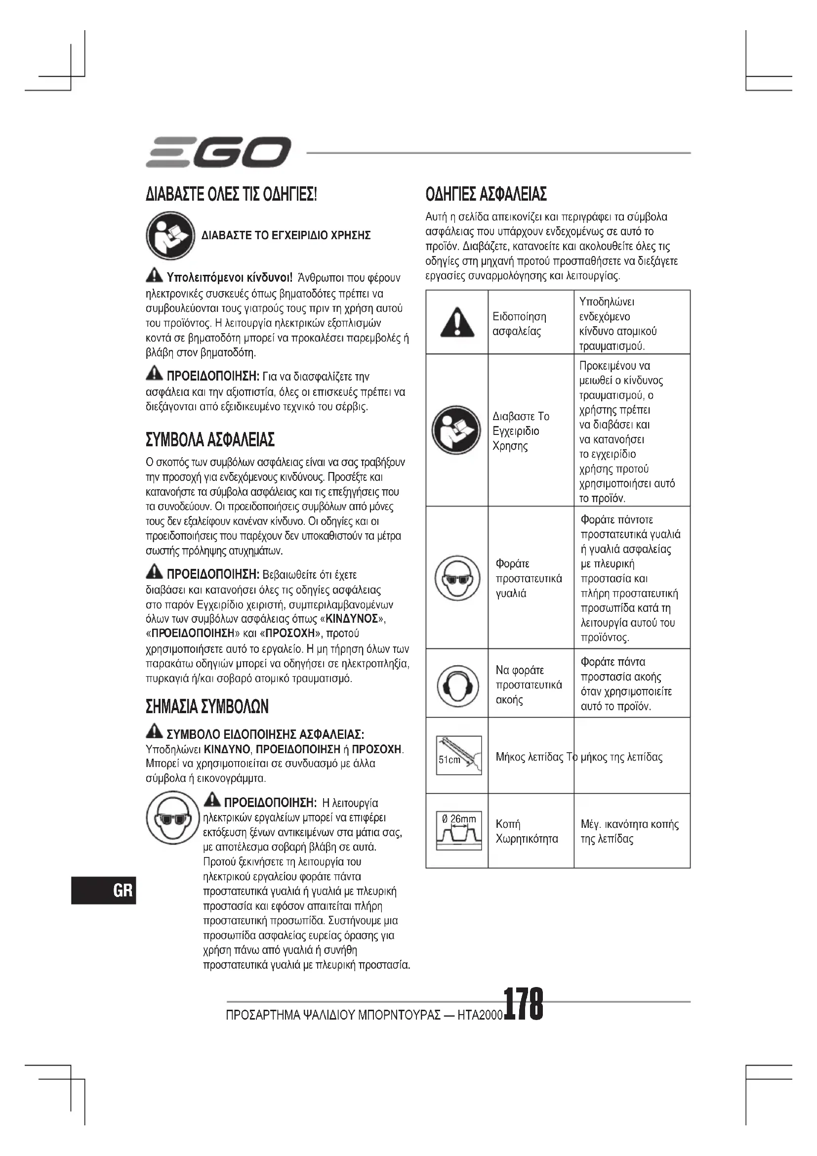 ◾ Η συντήρηση του ηλεκτρικού εργαλείου σας πρέπει να γίνεται από εξειδικευμένο τεχνικό επισκευών, χρησιμοποιώντας μόνο τα ίδια ανταλλακτικά. Έτσι διατηρείται η ασφαλής λειτουργία του ηλεκτρικού εργαλείου. ◾ Εάν προκύψουν καταστάσεις που δεν καλύπτονται στο παρόν εγχειρίδιο, να είστε προσεκτικοί και να κρίνετε σωστά. Επικοινωνήστε με το κέντρο σέρβις της EGO για βοήθεια. ΦΥΛΑΞΤΕ ΑΥΤΕΣ ΤΙΣ ΌΔΗΓΙΕΣ! ΠΡΌΣΘΕΤΌΙ ΕΙΔΙΚΌΙ ΚΑΝΌΝΕΣ ΑΣΦΑΛΕΙΑΣ ΥΠΑΡΧΌΥΝ ΣΤΌ ΙΣΧΥΌΝ ΕΓΧΕΙΡΙΔΙΌ ΧΡΗΣΤΗ ΤΌΥ ΠΡΌΣΑΡΤΗΜΑΤΌΣ ΠΡΌΔΙΑΓΡΑΦΕΣ