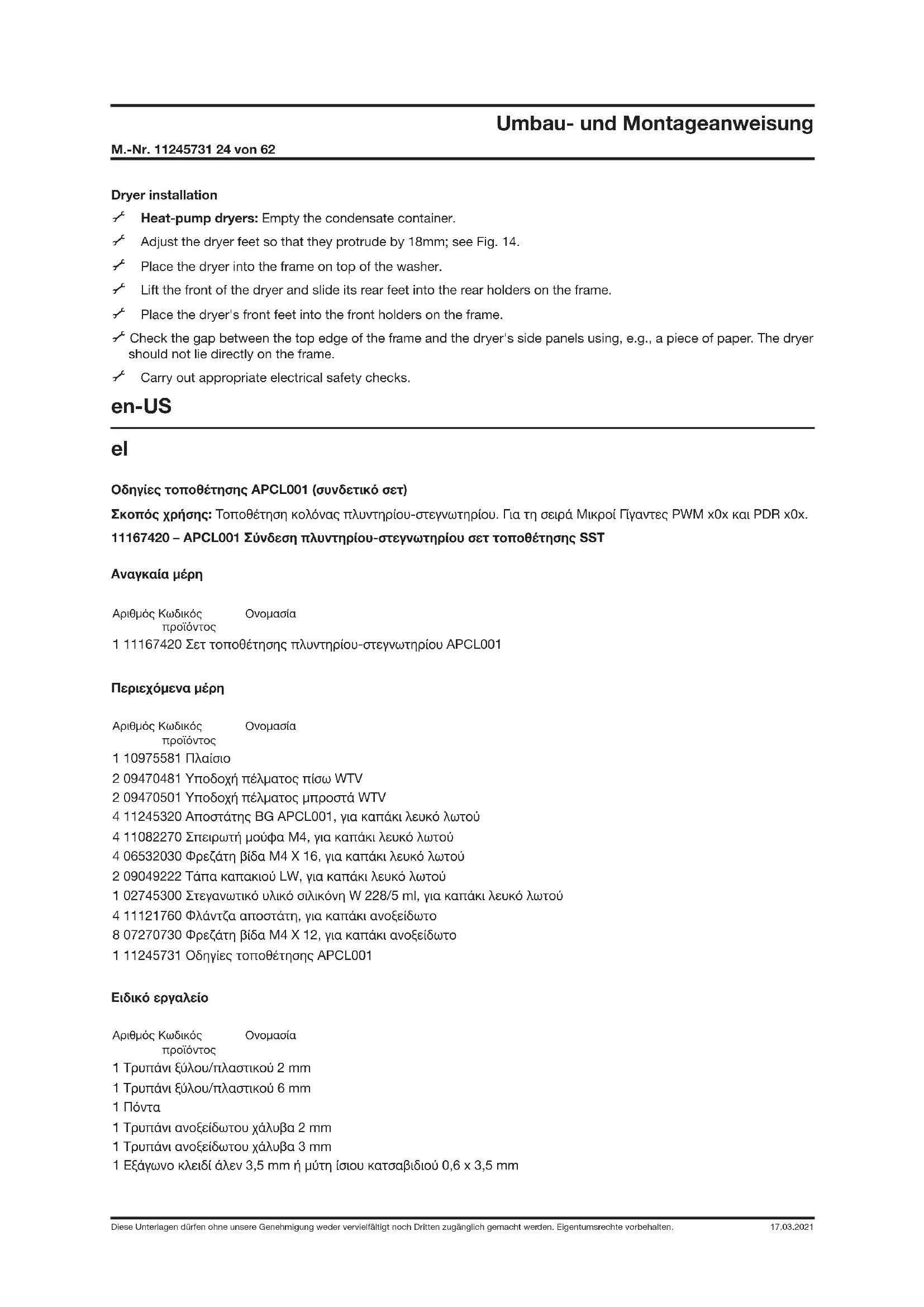 1 11167420 Σετ τοποθέτησης πλυντηρίου-στεγνωτηρίου APCL001 Περιεχόμενα μέρη Αριθμός Κωδικός