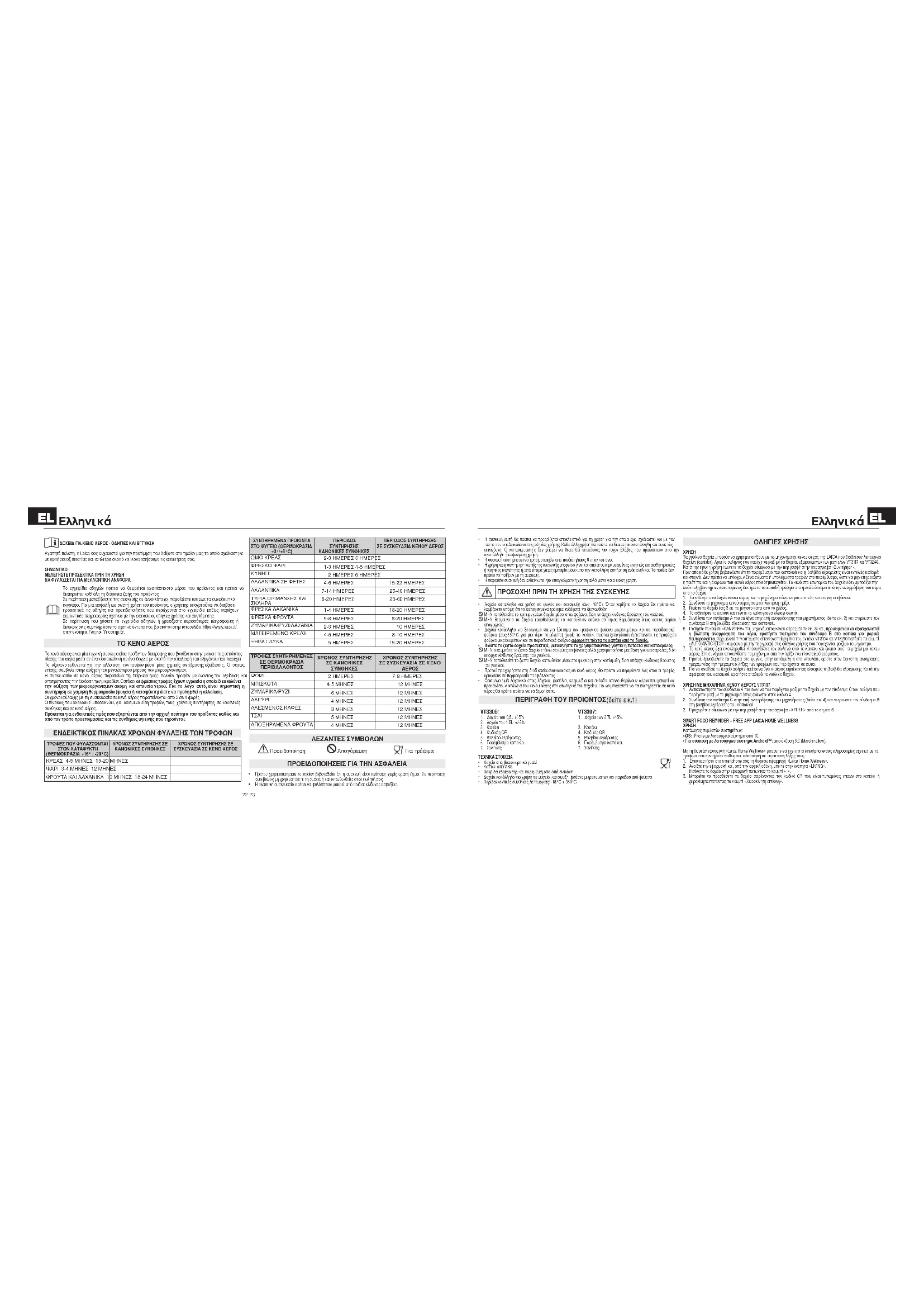 ΜΕΛΕΤΗΣΤΕ ΠΡΟΣΕΧΤΙΚΑ ΠΡΙΝ ΤΗ ΧΡΗΣΗ ΝΑ ΦΥΛΑΣΣΕΤΑΙ ΓΙΑ ΜΕΛΛΟΝΤΙΚΗ ΑΝΑΦΟΡΑ Το εγχειρίδιο οδηγιών πρέπει να θεωρείται αναπόσπαστο μέρος του προϊόντος και πρέπει να διατηρείται καθ’ όλη τη διάρκεια ζωής του προϊόντος. Σε περίπτωση μεταβίβασης της συσκευής σε άλλο κάτοχο, παραδώστε και όλα τα συνοδευτικά έγγραφα. Για μια ασφαλή και σωστή χρήση του προϊόντος, ο χρήστης υποχρεούται να διαβάσει προσεκτικά τις οδηγίες και προειδοποιήσεις που περιέχονται στο εγχειρίδιο καθώς παρέχουν σημαντικές πληροφορίες σχετικά με την ασφάλεια, οδηγίες χρήσης και συντήρησης. Σε περίπτωση που χάσετε το εγχειρίδιο οδηγιών ή χρειάζεστε περισσότερες πληροφορίες ή διευκρινίσεις συμπληρώστε το σχετικό έντυπο που βρίσκεται στην ιστοσελίδα https://www.laica.it/ στην ενότητα Faq και Υποστήριξη. ΤΟ ΚΕΝΟ ΑΕΡΟΣ Το κενό αέρος είναι μία τεχνική συσκευασίας προϊόντων διατροφής που βασίζεται στην μείωση της απόλυτης πίεσης του αέρα μέσα σε ένα σακουλάκι ή σε ένα δοχείο με σκοπό την απαλοιφή του οξυγόνου που περιέχει. Το οξυγόνο ευθύνεται για την αλλοίωση των τροφών μέσω μίας χημικής αντίδρασης οξείδωσης. Ο αέρας, επίσης, συμβάλει στην αύξηση του μεγαλύτερου μέρους των μικροοργανισμών. Η συσκευασία σε κενό αέρος παρατείνει τη διάρκεια ζωής πολλών τροφών μειώνοντας την οξείδωση και αποτρέποντας την διάδοση των μικροβίων. Ωστόσο, οι φρέσκες τροφές έχουν υγρασία η οποία διευκολύνει την αύξηση των μικροοργανισμών ακόμη και απουσία νερού. Για το λόγο αυτό, είναι σημαντική η συντήρηση σε χαμηλή θερμοκρασία (ψυγείο ή καταψύκτη) ώστε να προληφθεί η αλλοίωση. Οι χρόνοι φύλαξης με τη συσκευασία σε κενό αέρος παρατείνονται από 3 σε 4 φορές. Ο πίνακας που ακολουθεί υποδεικνύει, για ορισμένα είδη τροφών, τους χρόνους συντήρησης σε κανονικές συνθήκες και σε κενό αέρος. Πρόκειται για ενδεικτικές τιμές που εξαρτώνται από την αρχική ποιότητα του προϊόντος καθώς και από τον τρόπο προετοιμασίας και τις συνθήκες υγιεινής που τηρούνται. ΕΝΔΕΙΚΤΙΚΟΣ ΠΙΝΑΚΑΣ ΧΡΟΝΩΝ ΦΥΛΑΞΗΣ ΤΩΝ ΤΡΟΦΩΝ ΤΡΟΦΕΣ ΠΟΥ ΦΥΛΑΣΣΟΝΤΑΙ ΣΤΟΝ ΚΑΤΑΨΥΚΤΗ (ΘΕΡΜΟΚΡΑΣΙΑ -16° / -20°C) ΧΡΟΝΟΣ ΣΥΝΤΗΡΗΣΗΣ ΣΕ ΚΑΝΟΝΙΚΕΣ ΣΥΝΘΗΚΕΣ ΧΡΟΝΟΣ ΣΥΝΤΗΡΗΣΗΣ ΣΕ ΣΥΣΚΕΥΑΣΙΑ ΣΕ ΚΕΝΟ ΑΕΡΟΣ ΚΡΕΑΣ 4-5 ΜΗΝΕΣ 15-20 ΜΗΝΕΣ ΨΑΡΙ 3-4 ΜΗΝΕΣ 12 ΜΗΝΕΣ ΦΡΟΥΤΑ ΚΑΙ ΛΑΧΑΝΙΚΑ 10 ΜΗΝΕΣ 18-24 ΜΗΝΕΣ ΣΥΝΤΗΡΗΜΕΝΑ ΠΡΟΙΟΝΤΑ ΣΤΟ ΨΥΓΕΙΟ (ΘΕΡΜΟΚΡΑΣΙΑ +3°/+5°C)