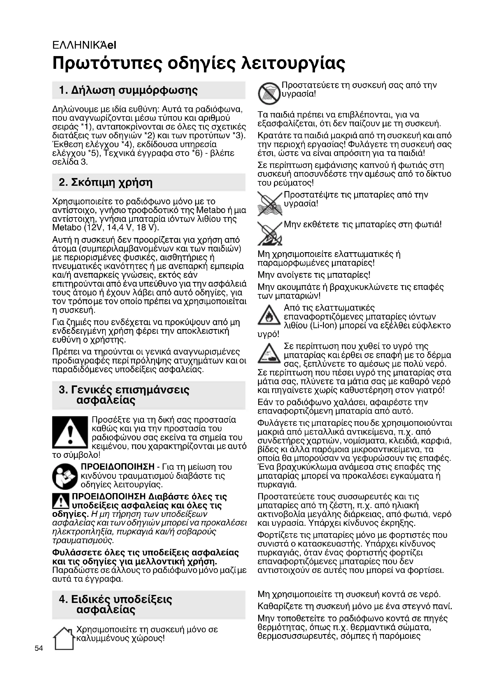 Οι επισκευές πρέπει να πραγματοποιούνται μόνο από ειδικευμένο προσωπικό με γνήσια εξαρτήματα. Οι επισκευές είναι απαραίτητες, όταν μια συσκευή έχει υποστεί οποιαδήποτε ζημιά. Εδώ ανήκουν εκτός των άλλων ένα ελαττωματικό τροφοδοτικό, όταν έχει εισχωρήσει νερό ή έχουν πέσει αντικείμενα πάνω στη συσκευή, όταν το ραδιόφωνο είχε εκτεθεί στη βροχή ή στην υγρασία, όταν δε λειτουργεί κανονικά ή έπεσε κάτω. Μην εκθέσετε αυτή τη συσκευή στη βροχή ή στην υγρασία, για να ελαχιστοποιήσετε τον κίνδυνος μιας πυρκαγιάς ή μιας ηλεκτροπληξίας. Η συσκευή δεν πρέπει να εκτεθεί σε στάξιμο ή πιτσιλιές νερού και δεν επιτρέπεται να τοποθετούνται πάνω στη συσκευή αντικείμενα που εμπεριέχουν υγρό. Χρησιμοποιείτε στη συσκευή μόνο τις προβλεπόμενες γι’ αυτήν επαναφορτιζόμενες μπαταρίες της Metabo. Η χρήση διαφορετικών επαναφορτιζόμενων μπαταριών μπορεί να οδηγήσει σε τραυματισμούς, πυρκαγιά ή και
