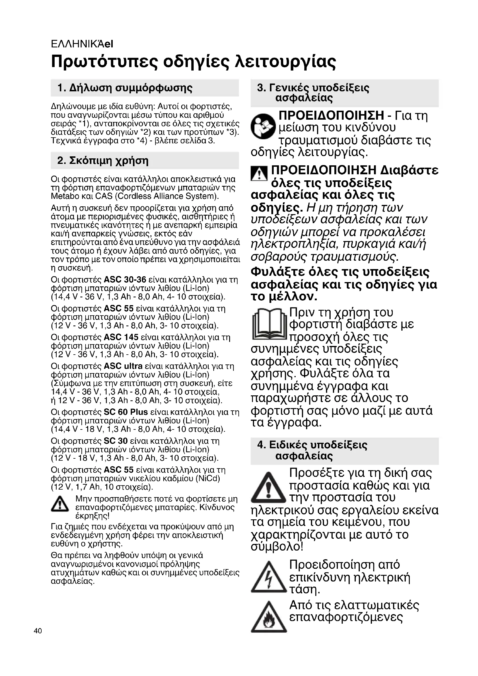 Πρωτότυπες οδηγίες λειτουργίας Δηλώνουμε με ιδία ευθύνη: Αυτοί οι φορτιστές, που αναγνωρίζονται μέσω τύπου και αριθμού σειράς *1), ανταποκρίνονται σε όλες τις σχετικές διατάξεις των οδηγιών *2) και των προτύπων *3). Τεχνικά έγγραφα στο *4) - βλέπε σελίδα 3. Οι φορτιστές είναι κατάλληλοι αποκλειστικά για τη φόρτιση επαναφορτιζόμενων μπαταριών της Metabo και CAS (Cordless Alliance System). Αυτή η συσκευή δεν προορίζεται για χρήση από άτομα με περιορισμένες φυσικές, αισθητήριες ή πνευματικές ικανότητες ή με ανεπαρκή εμπειρία και/ή ανεπαρκείς γνώσεις, εκτός εάν επιτηρούνται από ένα υπεύθυνο για την ασφάλειά τους άτομο ή έχουν λάβει από αυτό οδηγίες, για τον τρόπο με τον οποίο πρέπει να χρησιμοποιείται