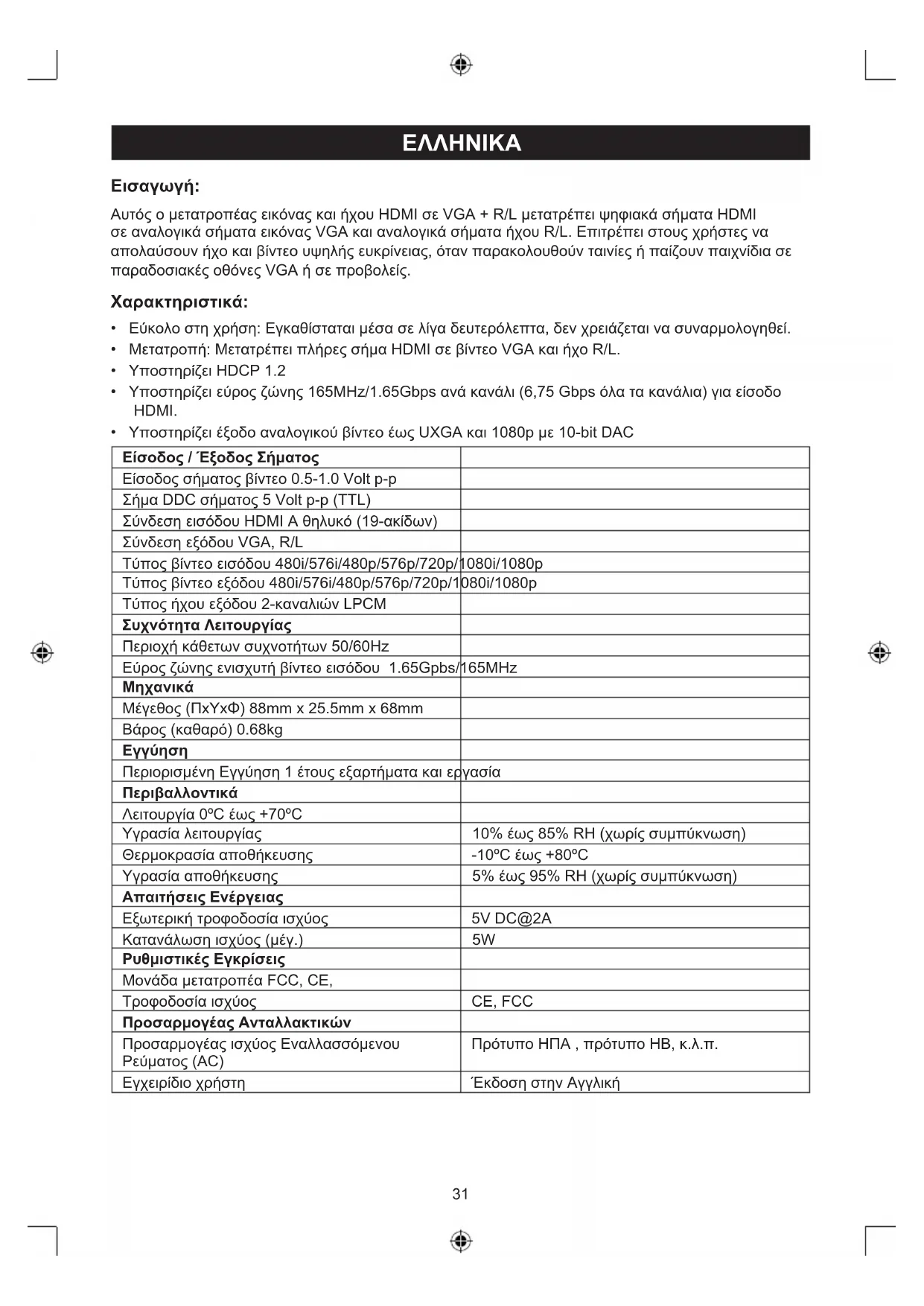- Υποστηρίζει έξοδο αναλογικού βίντεο έως UXGA και 1080p με 10-bit DAC Είσοδος / Έξοδος Σήματος Είσοδος σήματος βίντεο 0.5-1.0 Volt p-p Σήμα DDC σήματος 5 Volt p-p (TTL) Σύνδεση εισόδου HDMI A θηλυκό (19-ακίδων) Σύνδεση εξόδου VGA, R/L Τύπος βίντεο εισόδου 480i/576i/480p/576p/720p/1080i/1080p Τύπος βίντεο εξόδου 480i/576i/480p/576p/720p/1080i/1080p Τύπος ήχου εξόδου 2-καναλιών LPCM Συχνότητα Λειτουργίας Περιοχή κάθετων συχνοτήτων 50/60Hz Εύρος ζώνης ενισχυτή βίντεο εισόδου 1.65Gpbs/165MHz