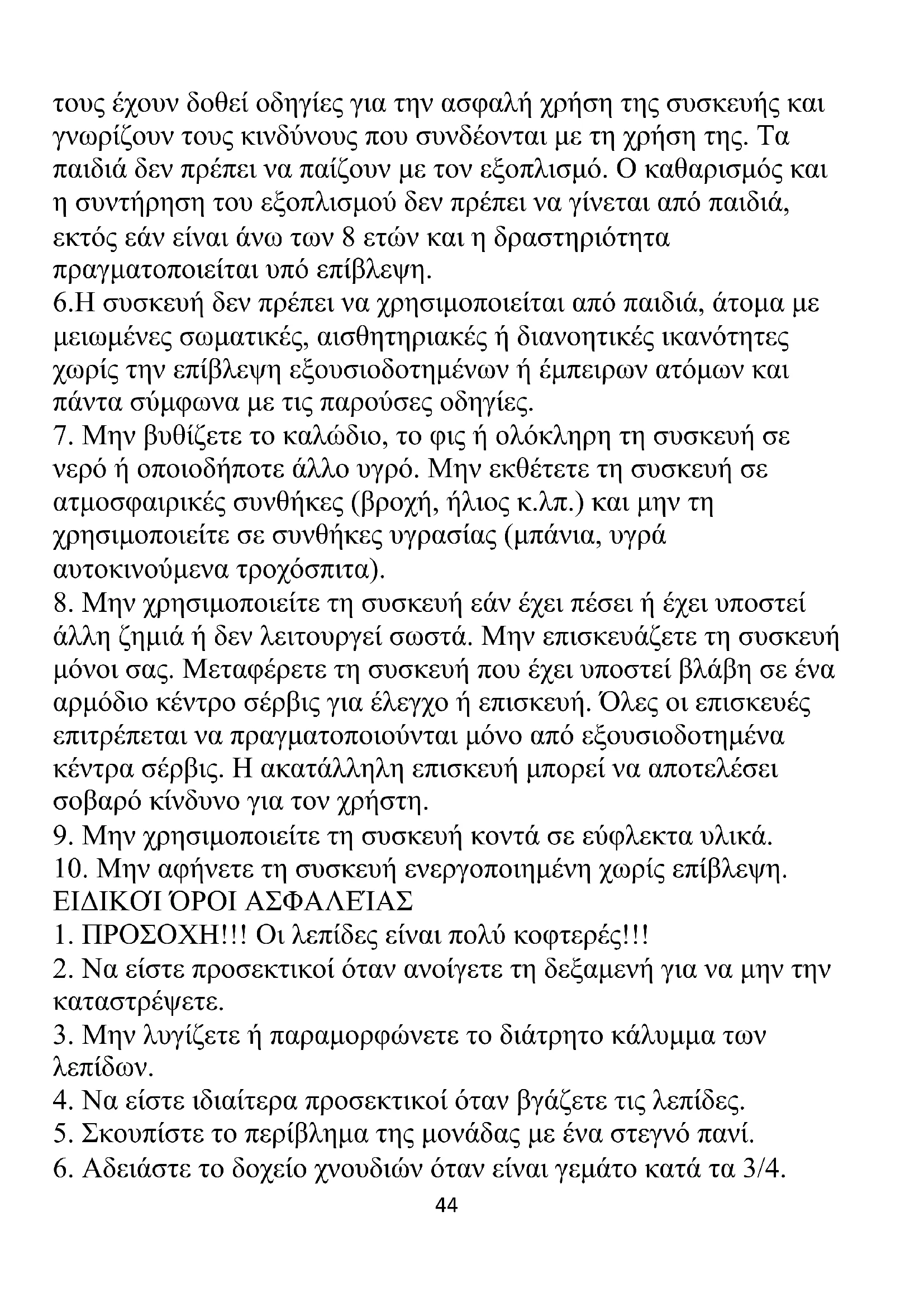από παιδιά άνω των 8 ετών και από άτομα με μειωμένες σωματικές, αισθητηριακές ή διανοητικές ικανότητες ή από άτομα χωρίς εμπειρία ή γνώση του εξοπλισμού, εφόσον αυτό γίνεται υπό την επίβλεψη ατόμου που είναι υπεύθυνο για την ασφάλειά τους ή44 τους έχουν δοθεί οδηγίες για την ασφαλή χρήση της συσκευής και γνωρίζουν τους κινδύνους που συνδέονται με τη χρήση της. Τα παιδιά δεν πρέπει να παίζουν με τον εξοπλισμό. Ο καθαρισμός και η συντήρηση του εξοπλισμού δεν πρέπει να γίνεται από παιδιά, εκτός εάν είναι άνω των 8 ετών και η δραστηριότητα πραγματοποιείται υπό επίβλεψη. 6.Η συσκευή δεν πρέπει να χρησιμοποιείται από παιδιά, άτομα με μειωμένες σωματικές, αισθητηριακές ή διανοητικές ικανότητες χωρίς την επίβλεψη εξουσιοδοτημένων ή έμπειρων ατόμων και πάντα σύμφωνα με τις παρούσες οδηγίες.