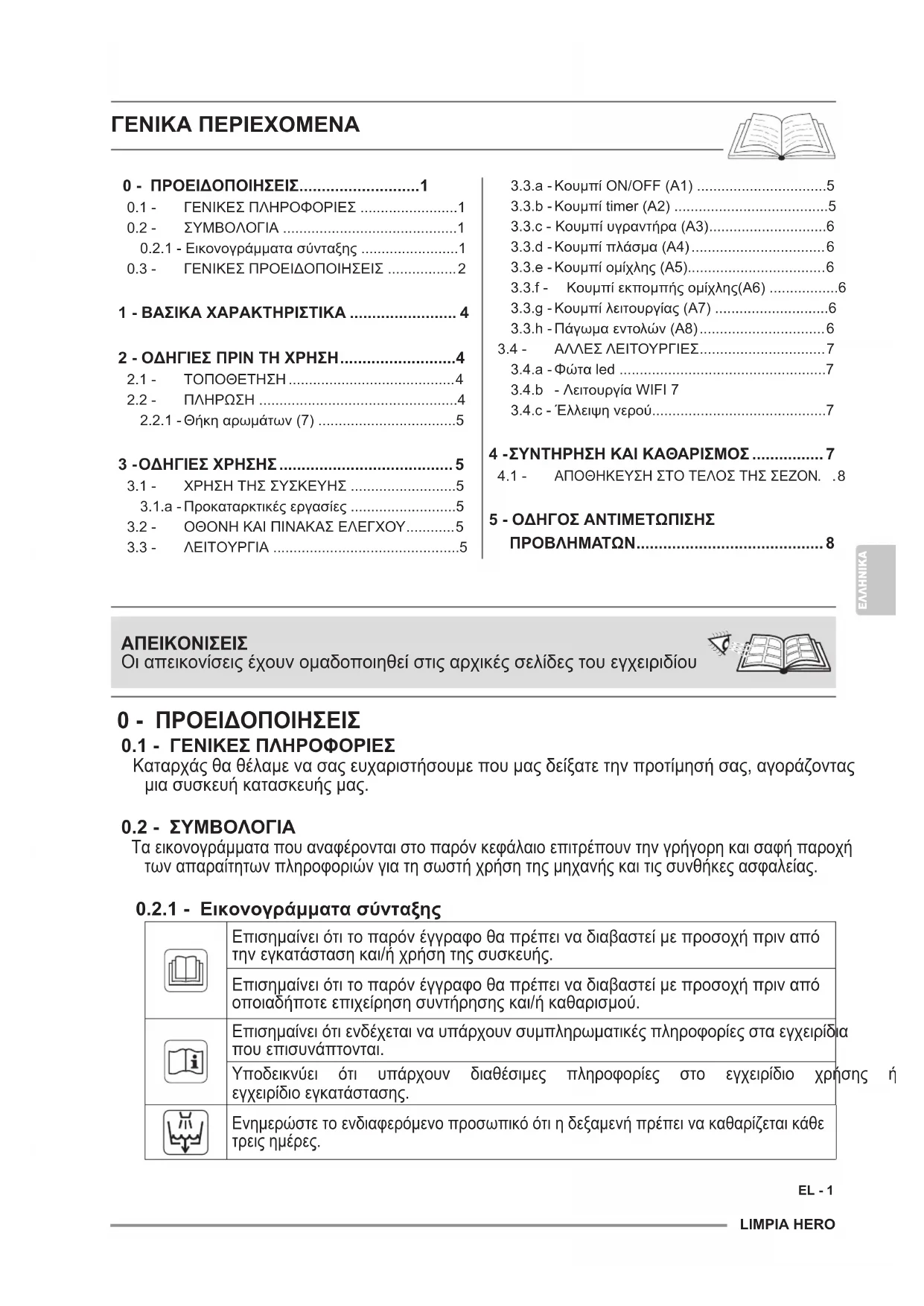 Επισημαίνειότιτοπαρόνέγγραφοθαπρέπειναδιαβαστείμεπροσοχήπριναπό τηνεγκατάστασηκαι/ήχρήσητηςσυσκευής. Επισημαίνειότιτοπαρόνέγγραφοθαπρέπειναδιαβαστείμεπροσοχήπριναπό οποιαδήποτεεπιχείρησησυντήρησηςκαι/ήκαθαρισμού. Επισημαίνειότιενδέχεταιναυπάρχουνσυμπληρωματικέςπληροφορίεςσταεγχειρίδια πουεπισυνάπτονται. Υποδεικνύει ότι υπάρχουν διαθέσιμες πληροφορίες στο εγχειρίδιο χρήσης ή στο εγχειρίδιοεγκατάστασης. Ενημερώστετοενδιαφερόμενοπροσωπικόότιηδεξαμενήπρέπεινακαθαρίζεταικάθε τρειςημέρες. ΓΕΝΙΚΑ ΠΕΡΙΕΧΟΜΕΝΑ ΑΠΕΙΚΟΝΙΣΕΙΣ Οιαπεικονίσειςέχουνομαδοποιηθείστιςαρχικέςσελίδεςτουεγχειριδίου