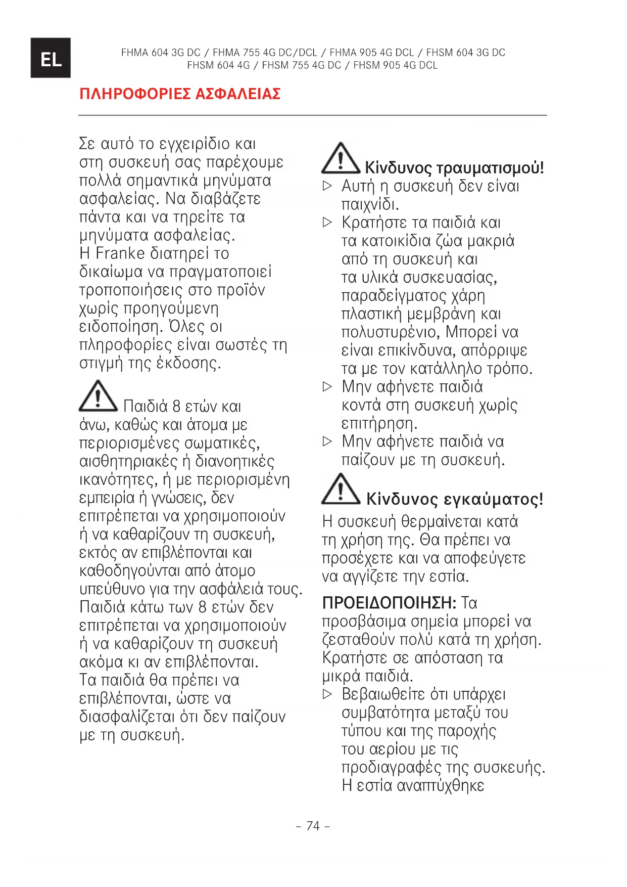 ΠΛΗΡΟΦΟΡΊΕΣ ΑΣΦΑΛΕΊΑΣ Σε αυτό το εγχειρίδιο και στη συσκευή σας παρέχουμε πολλά σημαντικά μηνύματα ασφαλείας. Να διαβάζετε πάντα και να τηρείτε τα μηνύματα ασφαλείας. Η Franke διατηρεί το δικαίωμα να πραγματοποιεί τροποποιήσεις στο προϊόν χωρίς προηγούμενη ειδοποίηση. Όλες οι πληροφορίες είναι σωστές τη στιγμή της έκδοσης. Παιδιά 8 ετών και άνω, καθώς και άτομα με περιορισμένες σωματικές, αισθητηριακές ή διανοητικές ικανότητες, ή με περιορισμένη εμπειρία ή γνώσεις, δεν επιτρέπεται να χρησιμοποιούν ή να καθαρίζουν τη συσκευή, εκτός αν επιβλέπονται και καθοδηγούνται από άτομο υπεύθυνο για την ασφάλειά τους. Παιδιά κάτω των 8 ετών δεν επιτρέπεται να χρησιμοποιούν ή να καθαρίζουν τη συσκευή ακόμα κι αν επιβλέπονται. Τα παιδιά θα πρέπει να επιβλέπονται, ώστε να διασφαλίζεται ότι δεν παίζουν με τη συσκευή. Κίνδυνος τραυματισμού!