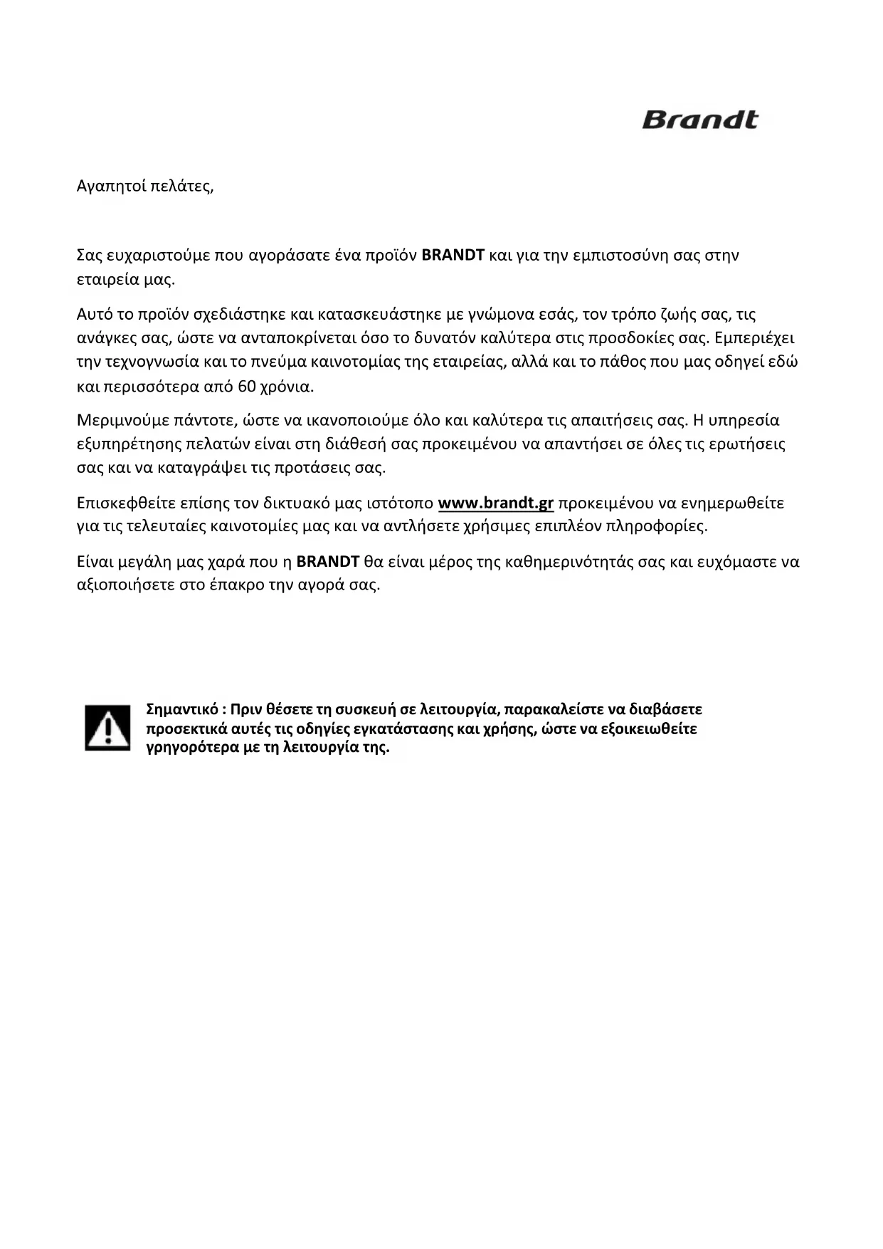 Σας ευχαριστούμε που αγοράσατε ένα προϊόν BRANDT και για την εμπιστοσύνη σας στην εταιρεία μας. Αυτό το προϊόν σχεδιάστηκε και κατασκευάστηκε με γνώμονα εσάς, τον τρόπο ζωής σας, τις ανάγκες σας, ώστε να ανταποκρίνεται όσο το δυνατόν καλύτερα στις προσδοκίες σας. Εμπεριέχει την τεχνογνωσία και το πνεύμα καινοτομίας της εταιρείας, αλλά και το πάθος που μας οδηγεί εδώ και περισσότερα από 60 χρόνια. Μεριμνούμε πάντοτε, ώστε να ικανοποιούμε όλο και καλύτερα τις απαιτήσεις σας. Η υπηρεσία εξυπηρέτησης πελατών είναι στη διάθεσή σας προκειμένου να απαντήσει σε όλες τις ερωτήσεις σας και να καταγράψει τις προτάσεις σας. Επισκεφθείτε επίσης τον δικτυακό μας ιστότοπο www.brandt.gr προκειμένου να ενημερωθείτε για τις τελευταίες καινοτομίες μας και να αντλήσετε χρήσιμες επιπλέον πληροφορίες. Είναι μεγάλη μας χαρά που η BRANDT θα είναι μέρος της καθημερινότητάς σας και ευχόμαστε να αξιοποιήσετε στο έπακρο την αγορά σας.
