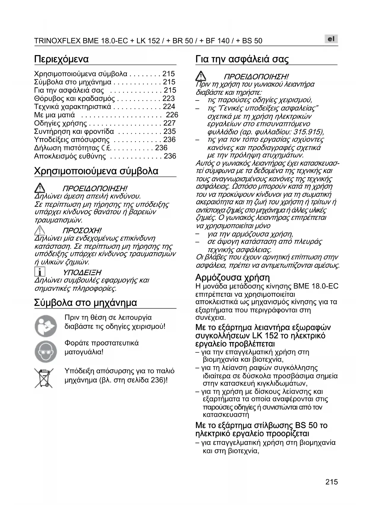 – για τη χρήση με ταινίες λείανσης και εξαρτήματα, τα οποία αναφέρονται στις οδηγίες αυτές ή συνιστώνται από τον κατασκευαστή. Υποδείξεις ασφαλείας για ηλεκτρικό εργαλείο με εξάρτημα λειαντήρα εξωραφών συγκολλήσεων ΠΡΟΕΙΔΟΠΟΙΗΣΗ! Διαβάστε όλες τις υποδείξεις ασφαλείας και τις οδηγίες. Παραλείψεις στην τήρηση των υποδείξεων ασφαλείας και των οδηγιών μπορεί να έχουν ως συνέπεια ηλεκτροπλη- ξία, πυρκαγιά και/ή βαριούς τραυματισμούς. Φυλάξτε όλες τις υποδείξεις ασφαλείας και τις οδηγίες για μελλοντική χρήση. Το παρόν ηλεκτρικό εργαλείο επιτρέπεται να χρησιμοποιείται ως λειαντήρας. Τηρείτε όλες τις υποδείξεις ασφαλείας και οδηγίες και προσέξτε τις γραφικές παραστάσεις και τα δεδομένα, τα οποία λαμβάνετε με το μηχάνημα. Αν δεν τηρήσετε τις ακόλουθες οδηγίες μπορεί να προκληθεί ηλεκτροπληξία, πυρκαγιά και/ ή βαριά τραύματα. Το παρόν ηλεκτρικό εργαλείο δεν είναι κατάλληλο για λείανση με σμυριδόχαρτο, εργασίες με συρματόβουρτσες, στίλβωση και λείανση κοπής. Χρήσεις, για τις οποίες δεν προορίζεται το ηλεκτρικό εργαλείο, μπορεί να προκαλέσουν κινδύνους και τραυματισμούς. Μη χρησιμοποιείτε ποτέ εξαρτήματα, τα οποία δεν έχουν προβλεφθεί από τον κατασκευαστή ειδικά γι' αυτό το ηλεκτρικό εργαλείο. Η δυνατότητα στερέωσης των εξαρτημάτων στο ηλεκτρικό εργαλείο δεν μπορεί να εγγυηθεί την ασφαλή χρήση. Ο επιτρεπτός αριθμός στροφών του εργαλείου εφαρμογής πρέπει να είναι τουλάχιστον όσος ο μέγιστος αριθμός στροφών που αναγράφεται στο ηλεκτρικό εργαλείο. Εξαρτήματα, τα οποία περιστρέφονται ταχύτερα απ' ό,τι επιτρέπεται, μπορεί να σπάσουν και να εκσφενδονιστούν προς όλες τις κατευθύνσεις. Η εξωτερική διάμετρος και το πάχος του εργαλείου εφαρμογής πρέπει να ανταποκρίνονται στα στοιχεία με τις διαστάσεις του ηλεκτρικού εργαλείου σας. Εργαλεία εφαρμογής με λανθασμένες διαστάσεις δεν τυγχάνουν επαρκούς προστασίας ούτε μπορούν να ελεγχθούν. Οι δίσκοι λείανσης, η υποδοχή των δίσκων λείανσης ή τα άλλα εξαρτήματα πρέπει να ταιριάζουν ακριβώς με την άτρακτο λείανσης του ηλεκτρικού εργαλείου σας. Τα εργαλεία εφαρμογής, τα οποία δεν ταιριάζουν ακριβώς στην άτρακτο λείανσης του ηλεκτρικού εργαλείου, προξενούν πολύ ισχυρούς κραδασμούς και μπορούν να οδηγήσουν στην απώλεια του ελέγχου. Μη χρησιμοποιήσετε κατεστραμμένα εργαλεία εφαρμογής. Πριν από κάθε χρήση ελέγχετε τα εργαλεία εφαρμογής για γρέζια και ρωγμές και την υποδοχή των δίσκων λείανσης για ρωγμές, φθορά από τη μακρά χρήση ή την πολυκαιρία. Αν το ηλεκτρικό εργαλείο ή το εργαλείοTRINOXFLEX BME 18.0-EC + LK 152 / + BR 50 / + BF 140 / + BS 50