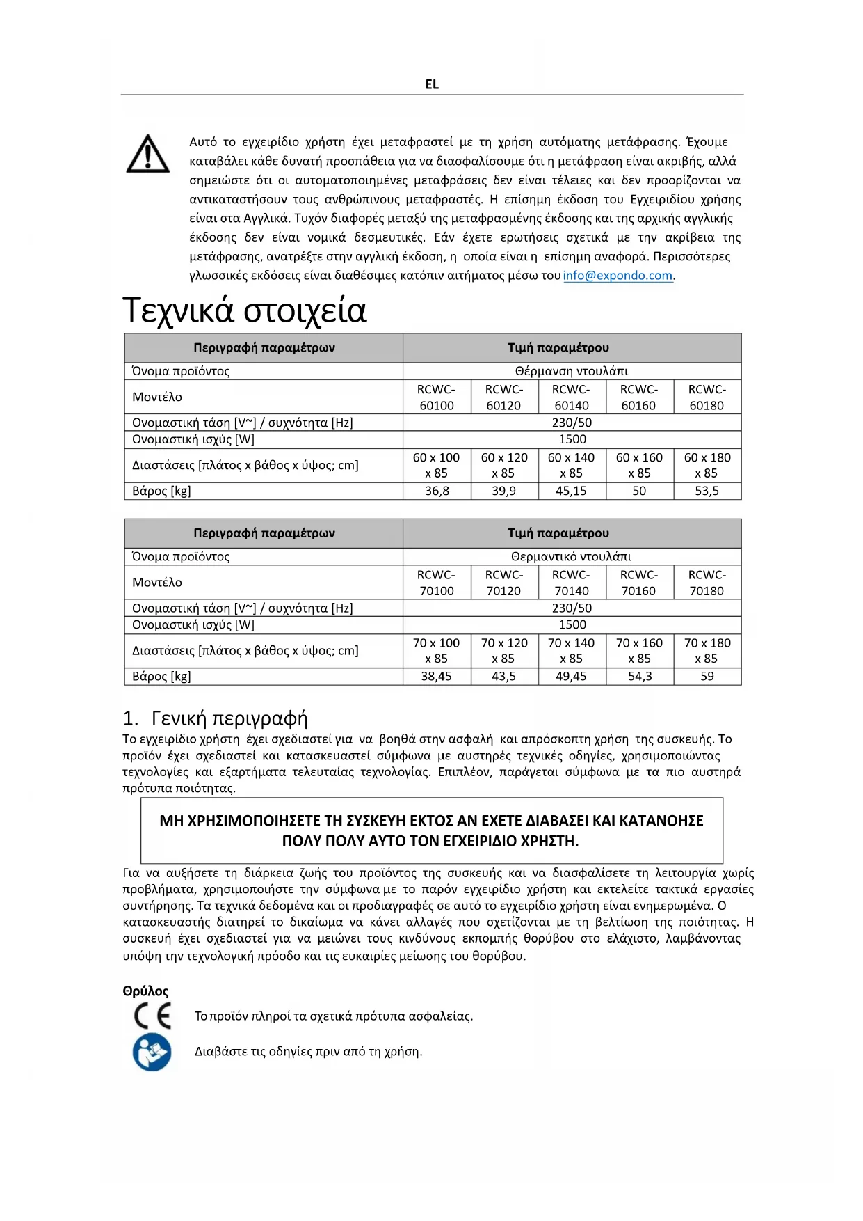 се открият повреди. j) Използвайте мека, влажна кърпа за почистване. k) Не използвайте остри и/или метални предмети за почистване (напр. телена четка или метална шпатула), защото те могат да повредят повърхностния материал на уреда. l) Не почиствайте устройството с киселинни вещества, препарати за медицински цели, разредители, гориво, масла или други химически вещества, защото това може да повреди устройството. ИЗХВЪРЛЯНЕ НА ИЗПОЛЗВАНИ УСТРОЙСТВА: Не изхвърляйте това устройство в общинските системи за отпадъци. Предайте го в пункт за рециклиране и събиране на електрически и електрически уреди. Проверете символа върху продукта, ръководството за употреба и опаковката. Пластмасите, използвани за конструиране на устройството, могат да бъдат рециклирани в съответствие с техните маркировки. Избирайки да рециклирате, вие допринасяте значително за опазването на околната среда. Свържете се с местните власти за информация относно местното съоръжение за рециклиране.EL Αυτό το εγχειρίδιο χρήστη έχει μεταφραστεί με τη χρήση αυτόματης μετάφρασης. Έχουμε καταβάλει κάθε δυνατή προσπάθεια για να διασφαλίσουμε ότι η μετάφραση είναι ακριβής, αλλά σημειώστε ότι οι αυτοματοποιημένες μεταφράσεις δεν είναι τέλειες και δεν προορίζονται να αντικαταστήσουν τους ανθρώπινους μεταφραστές. Η επίσημη έκδοση του Εγχειριδίου χρήσης είναι στα Αγγλικά. Τυχόν διαφορές μεταξύ της μεταφρασμένης έκδοσης και της αρχικής αγγλικής έκδοσης δεν είναι νομικά δεσμευτικές. Εάν έχετε ερωτήσεις σχετικά με την ακρίβεια της μετάφρασης, ανατρέξτε στην αγγλική έκδοση, η οποία είναι η επίσημη αναφορά. Περισσότερες γλωσσικές εκδόσεις είναι διαθέσιμες κατόπιν αιτήματος μέσω του info@expondo.com. Τεχνικά στοιχεία Περιγραφή παραμέτρων Τιμή παραμέτρου Όνομα προϊόντος Θέρμανση ντουλάπι