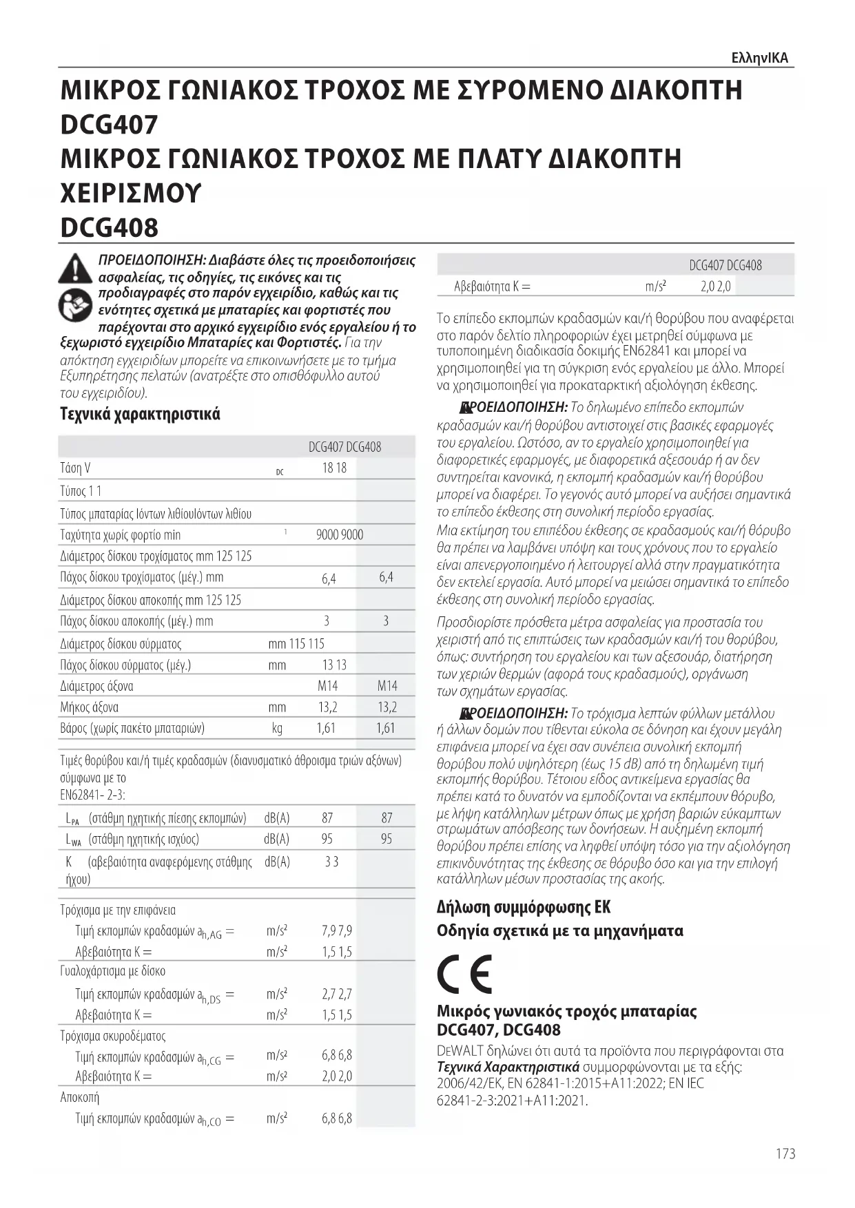 Μικρός γωνιακός τροχός μπαταρίας DCG407, DCG408 DeWALT δηλώνει ότι αυτά τα προϊόντα που περιγράφονται στα Τεχνικά Χαρακτηριστικά συμμορφώνονται με τα εξής: 2006/42/ΕΚ, EN 62841‑1:2015+A11:2022; EN IEC 62841‑2‑3:2021+A11:2021.Το επίπεδο εκπομπών κραδασμών και/ή θορύβου που αναφέρεται στο παρόν δελτίο πληροφοριών έχει μετρηθεί σύμφωνα με τυποποιημένη διαδικασία δοκιμής EN62841 και μπορεί να χρησιμοποιηθεί για τη σύγκριση ενός εργαλείου με άλλο. Μπορεί να χρησιμοποιηθεί για προκαταρκτική αξιολόγησηέκθεσης. ΠΡΟΕΙΔΟΠΟΙΗΣΗ: Το δηλωμένο επίπεδο εκπομπών κραδασμών και/ή θορύβου αντιστοιχεί στις βασικές εφαρμογές του εργαλείου. Ωστόσο, αν το εργαλείο χρησιμοποιηθεί για διαφορετικές εφαρμογές, με διαφορετικά αξεσουάρ ή αν δεν συντηρείται κανονικά, η εκπομπή κραδασμών και/ή θορύβου μπορεί να διαφέρει. Το γεγονός αυτό μπορεί να αυξήσει σημαντικά το επίπεδο έκθεσης στη συνολική περίοδοεργασίας.Μια εκτίμηση του επιπέδου έκθεσης σε κραδασμούς και/ή θόρυβο θα πρέπει να λαμβάνει υπόψη και τους χρόνους που το εργαλείο είναι απενεργοποιημένο ή λειτουργεί αλλά στην πραγματικότητα δεν εκτελεί εργασία. Αυτό μπορεί να μειώσει σημαντικά το επίπεδο έκθεσης στη συνολική περίοδοεργασίας.Προσδιορίστε πρόσθετα μέτρα ασφαλείας για προστασία του χειριστή από τις επιπτώσεις των κραδασμών και/ή του θορύβου, όπως: συντήρηση του εργαλείου και των αξεσουάρ, διατήρηση των χεριών θερμών (αφορά τους κραδασμούς), οργάνωση τωνσχημάτωνεργασίας. ΠΡΟΕΙΔΟΠΟΙΗΣΗ: Το τρόχισμα λεπτών φύλλων μετάλλου ή άλλων δομών που τίθενται εύκολα σε δόνηση και έχουν μεγάλη επιφάνεια μπορεί να έχει σαν συνέπεια συνολική εκπομπή θορύβου πολύ υψηλότερη (έως 15dB) από τη δηλωμένη τιμή εκπομπής θορύβου. Τέτοιου είδος αντικείμενα εργασίας θα πρέπει κατά το δυνατόν να εμποδίζονται να εκπέμπουν θόρυβο, με λήψη κατάλληλων μέτρων όπως με χρήση βαριών εύκαμπτων στρωμάτων απόσβεσης των δονήσεων. Η αυξημένη εκπομπή θορύβου πρέπει επίσης να ληφθεί υπόψη τόσο για την αξιολόγηση επικινδυνότητας της έκθεσης σε θόρυβο όσο και για την επιλογή κατάλληλων μέσων προστασίας τηςακοής.DCG407 DCG408Αβεβαιότητα K = m/s
