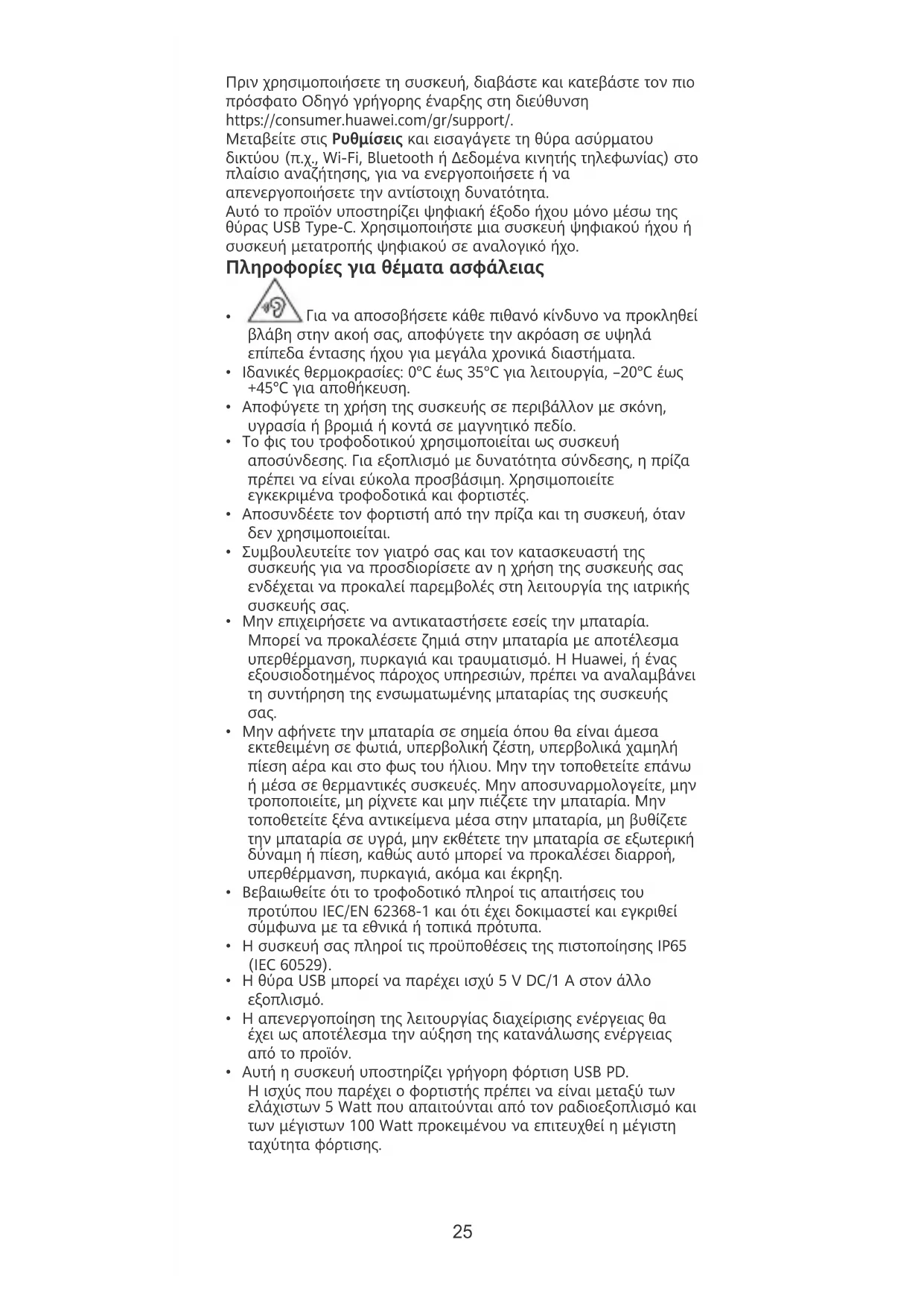 24Πριν χρησιμοποιήσετε τη συσκευή, διαβάστε και κατεβάστε τον πιο πρόσφατο Οδηγό γρήγορης έναρξης στη διεύθυνση https://consumer.huawei.com/gr/support/. Μεταβείτε στις Ρυθμίσεις και εισαγάγετε τη θύρα ασύρματου δικτύου (π.χ., Wi-Fi, Bluetooth ή Δεδομένα κινητής τηλεφωνίας) στο πλαίσιο αναζήτησης, για να ενεργοποιήσετε ή να απενεργοποιήσετε την αντίστοιχη δυνατότητα. Αυτό το προϊόν υποστηρίζει ψηφιακή έξοδο ήχου μόνο μέσω της θύρας USB Type-C. Χρησιμοποιήστε μια συσκευή ψηφιακού ήχου ή συσκευή μετατροπής ψηφιακού σε αναλογικό ήχο. Πληροφορίες για θέματα ασφάλειας