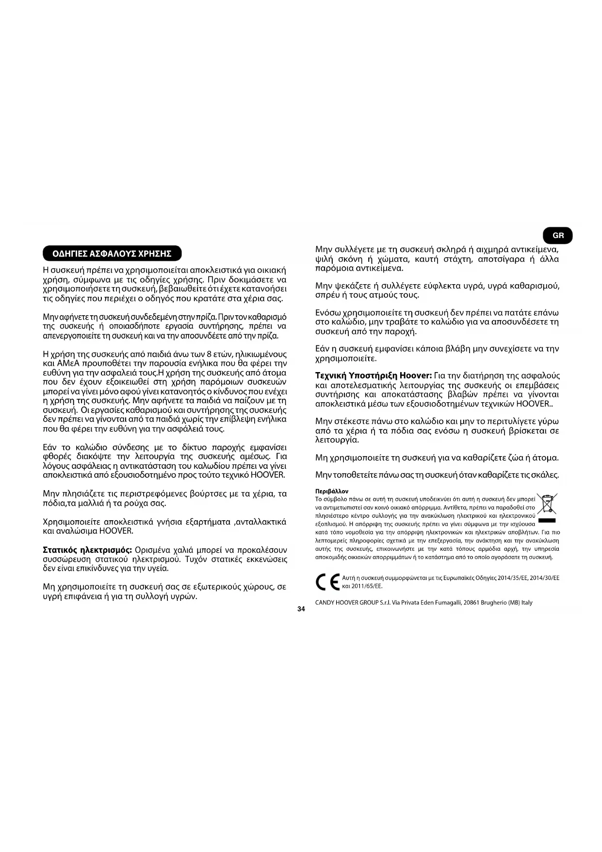- Vain joissakin malleissa ** Voi vaihdella mallista riippuen FI34 ΟΔΗΓΙΕΣ ΑΣΦΑΛΟΥΣ ΧΡΗΣΗΣ H συσκευή πρέπει να χρησιμοποιείται αποκλειστικά για οικιακή χρήση, σύμφωνα με τις οδηγίες χρήσης. Πριν δοκιμάσετε να χρησιμοποιήσετε τη συσκευή, βεβαιωθείτε ότι έχετε κατανοήσει τις οδηγίες που περιέχει ο οδηγός που κρατάτε στα χέρια σας. Μην αφήνετε τη συσκευή συνδεδεμένη στην πρίζα. Πριν τον καθαρισμό της συσκευής ή οποιασδήποτε εργασία συντήρησης, πρέπει να απενεργοποιείτε τη συσκευή και να την αποσυνδέετε από την πρίζα. Η χρήση της συσκευής από παιδιά άνω των 8 ετών, ηλικιωμένους και ΑΜεΑ προυποθέτει την παρουσία ενήλικα που θα φέρει την ευθύνη για την ασφαλειά τους.Η χρήση της συσκευής από άτομα που δεν έχουν εξοικειωθεί στη χρήση παρόμοιων συσκευών μπορεί να γίνει μόνο αφού γίνει κατανοητός ο κίνδυνος που ενέχει η χρήση της συσκευής. Μην αφήνετε τα παιδιά να παίζουν με τη συσκευή. Οι εργασίες καθαρισμού και συντήρησης της συσκευής δεν πρέπει να γίνονται από τα παιδιά χωρίς την επίβλεψη ενήλικα που θα φέρει την ευθύνη για την ασφάλειά τους. Εάν το καλώδιο σύνδεσης με το δίκτυο παροχής εμφανίσει φθορές διακόψτε την λειτουργία της συσκευής αμέσως. Για λόγους ασφάλειας η αντικατάσταση του καλωδίου πρέπει να γίνει αποκλειστικά από εξουσιοδοτημένο προς τούτο τεχνικό HOOVER. Μην πλησιάζετε τις περιστρεφόμενες βούρτσες με τα χέρια, τα πόδια,τα μαλλιά ή τα ρούχα σας. Χρησιμοποιείτε αποκλειστικά γνήσια εξαρτήματα ,ανταλλακτικά και αναλώσιμα HOOVER. Στατικός ηλεκτρισμός: Ορισμένα χαλιά μπορεί να προκαλέσουν συσσώρευση στατικού ηλεκτρισμού. Τυχόν στατικές εκκενώσεις δεν είναι επικίνδυνες για την υγεία. Μη χρησιμοποιείτε τη συσκευή σας σε εξωτερικούς χώρους, σε υγρή επιφάνεια ή για τη συλλογή υγρών. Μην συλλέγετε με τη συσκευή σκληρά ή αιχμηρά αντικείμενα, ψιλή σκόνη ή χώματα, καυτή στάχτη, αποτσίγαρα ή άλλα παρόμοια αντικείμενα. Μην ψεκάζετε ή συλλέγετε εύφλεκτα υγρά, υγρά καθαρισμού, σπρέυ ή τους ατμούς τους. Ενόσω χρησιμοποιείτε τη συσκευή δεν πρέπει να πατάτε επάνω στο καλώδιο, μην τραβάτε το καλώδιο για να αποσυνδέσετε τη συσκευή από την παροχή. Εάν η συσκευή εμφανίσει κάποια βλάβη μην συνεχίσετε να την χρησιμοποιείτε. Τεχνική Υποστήριξη Hoover: Για την διατήρηση της ασφαλούς και αποτελεσματικής λειτουργίας της συσκευής οι επεμβάσεις συντήρισης και αποκατάστασης βλαβών πρέπει να γίνονται αποκλειστικά μέσω των εξουσιοδοτημένων τεχνικών HOOVER.. Μην στέκεστε πάνω στο καλώδιο και μην το περιτυλίγετε γύρω από τα χέρια ή τα πόδια σας ενόσω η συσκευή βρίσκεται σε λειτουργία. Μη χρησιμοποιείτε τη συσκευή για να καθαρίζετε ζώα ή άτομα. Μην τοποθετείτε πάνω σας τη συσκευή όταν καθαρίζετε τις σκάλες.