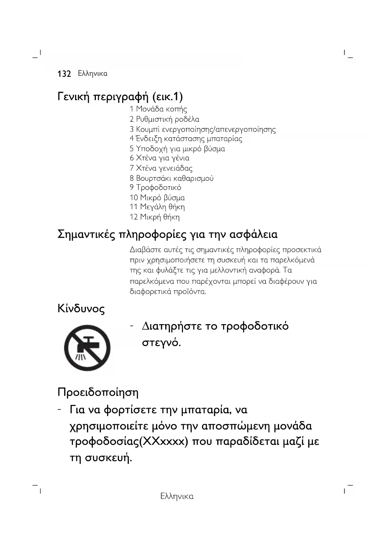 TürkçeΕλληνικα Γενική περιγραφή (εικ.1) 1 Μονάδα κοπής 2 Ρυθμιστική ροδέλα 3 Κουμπί ενεργοποίησης/απενεργοποίησης 4 Ένδειξη κατάστασης μπαταρίας 5 Υποδοχή για μικρό βύσμα 6 Χτένα για γένια 7 Χτένα γενειάδας 8 Βουρτσάκι καθαρισμού 9 Τροφοδοτικό 10 Μικρό βύσμα 11 Μεγάλη θήκη 12 Μικρή θήκη Σημαντικές πληροφορίες για την ασφάλεια Διαβάστε αυτές τις σημαντικές πληροφορίες προσεκτικά πριν χρησιμοποιήσετε τη συσκευή και τα παρελκόμενά της και φυλάξτε τις για μελλοντική αναφορά. Τα παρελκόμενα που παρέχονται μπορεί να διαφέρουν για διαφορετικά προϊόντα.