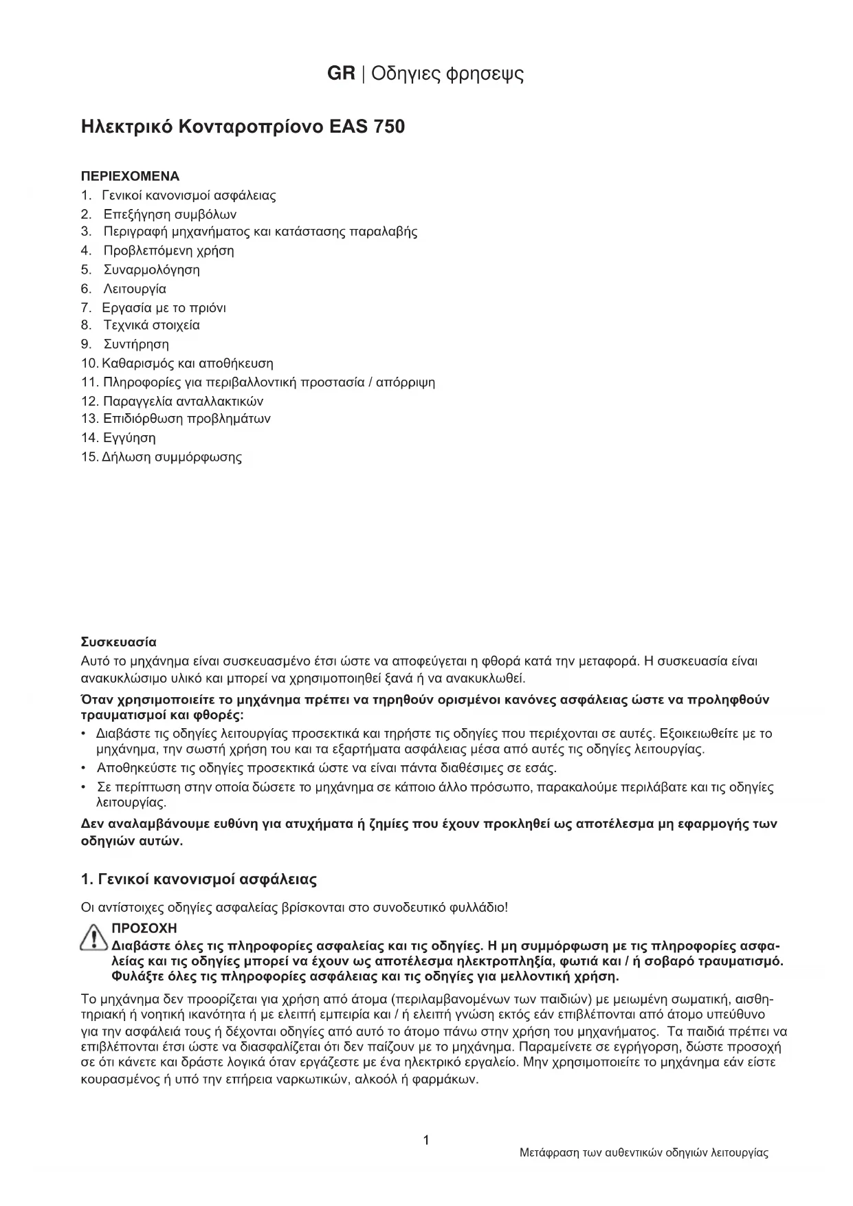 Ηλεκτρικό Κονταροπρίονο EAS 750 ΠΕΡΙΕΧΟΜΕΝΑ