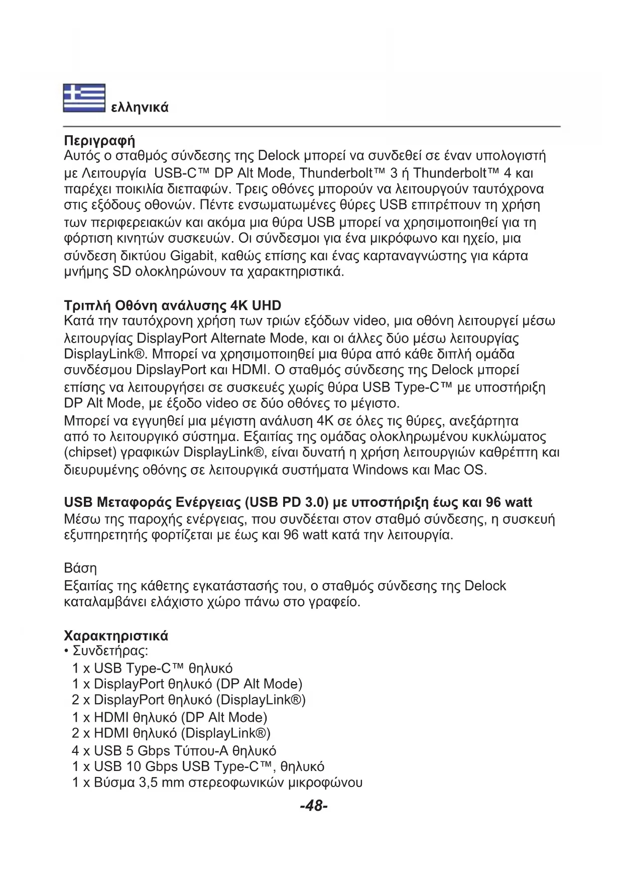 - Συνδετήρας: 1 x USB Type-C™ θηλυκό 1 x DisplayPort θηλυκό (DP Alt Mode) 2 x DisplayPort θηλυκό (DisplayLink®) 1 x HDMI θηλυκό (DP Alt Mode) 2 x HDMI θηλυκό (DisplayLink®) 4 x USB 5 Gbps Τύπου-A θηλυκό 1 x USB 10 Gbps USB Type-C™, θηλυκό 1 x Βύσμα 3,5 mm στερεοφωνικών μικροφώνου-49-