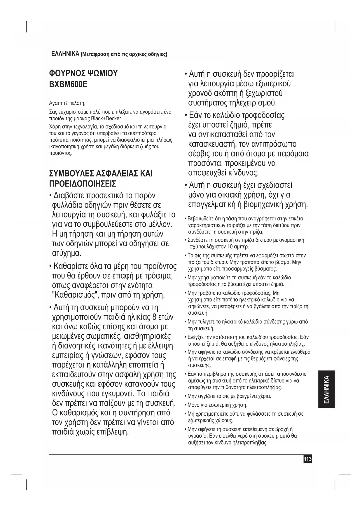 ΕΛΛΗΝΙΚΆ (Μετάφραση από τις αρχικές οδηγίες) ΦΟΎΡΝΟΣ ΨΩΜΙΟΎ BXBM600E Αγαπητέ πελάτη, Σας ευχαριστούμε πολύ που επιλέξατε να αγοράσετε ένα προϊόν της μάρκας Black+Decker. Χάρη στην τεχνολογία, το σχεδιασμό και τη λειτουργία του και το γεγονός ότι υπερβαίνει τα αυστηρότερα πρότυπα ποιότητας, μπορεί να διασφαλιστεί μια πλήρως ικανοποιητική χρήση και μεγάλη διάρκεια ζωής του