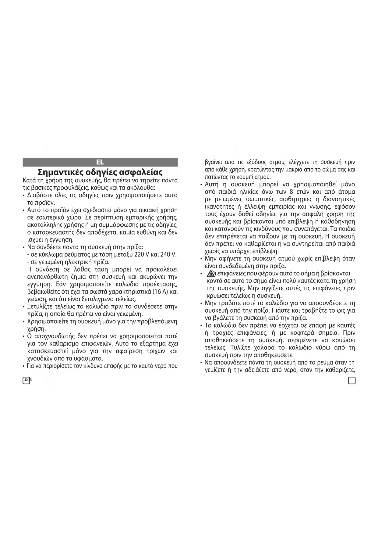 - Αυτή η συσκευή μπορεί να χρησιμοποιηθεί μόνο από παιδιά ηλικίας άνω των 8 ετών και από άτομα με μειωμένες σωματικές, αισθητήριες ή διανοητικές ικανότητες ή έλλειψη εμπειρίας και γνώσης, εφόσον τους έχουν δοθεί οδηγίες για την ασφαλή χρήση της συσκευής και βρίσκονται υπό επίβλεψη ή καθοδήγηση και κατανοούν τις κινδύνους που συνεπάγεται. Τα παιδιά δεν επιτρέπεται να παίζουν με τη συσκευή. Η συσκευή δεν πρέπει να καθαρίζεται ή να συντηρείται από παιδιά χωρίς να υπάρχει επίβλεψη.