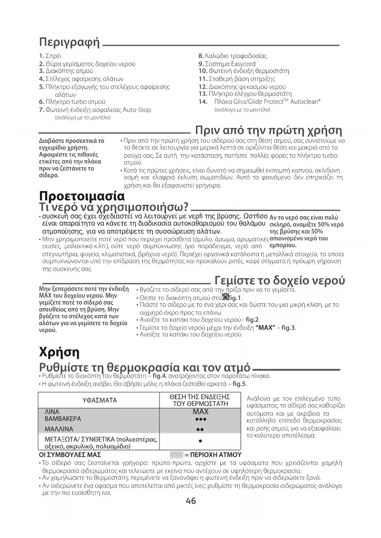 - Ρυθμίστε τη θερμοκρασία ανάλογα με το ύφασμα που σιδερώνετε.• Θέστε το διακόπτη ατμού στο – fig.1.• Μπορείτε να σιδερώσετε μόλις σβήσει η φωτεινή ένδειξη. Λειτουργία Plus Πλάκα Gliss/Glide Protect