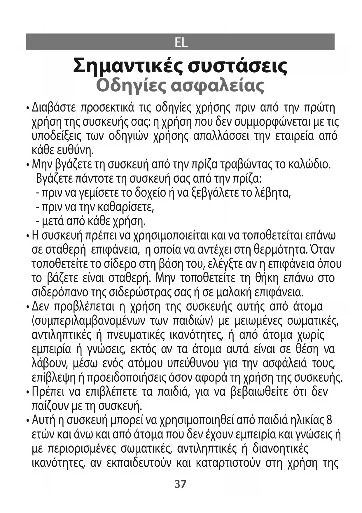 1800131945 GV52XX E0_110x154 22/11/13 09:27 Page37συσκευής με ασφαλή τρόπο και γνωρίζουν τους κινδύνους που διατρέχουν. Τα παιδιά δεν πρέπει να παίζουν με τη συσκευή. Ο καθαρισμός και η συντήρηση από το χρήστη δεν πρέπει να πραγματοποιείται από παιδιά, παρά μόνο αν έχουν ηλικία από 8 ετών και άνω και επιβλέπονται. Διατηρείτε τη συσκευή και το καλώδιό της σε μέρος που να μην τη φτάνουν παιδιά μικρότερα από 8 ετών.