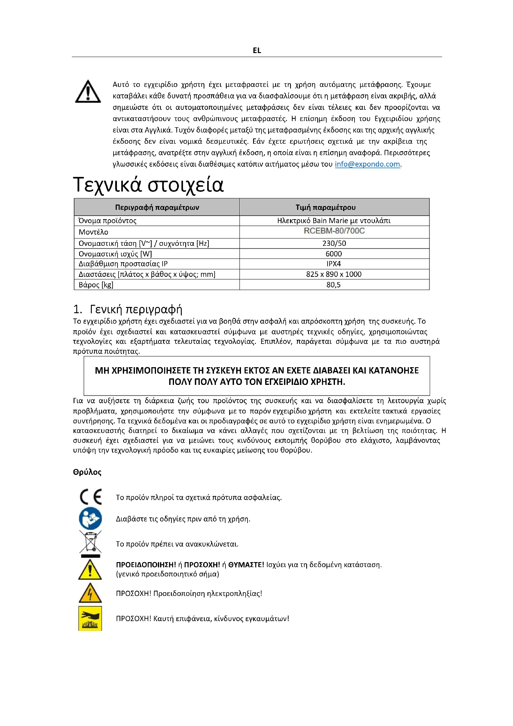 Αυτό το εγχειρίδιο χρήστη έχει μεταφραστεί με τη χρήση αυτόματης μετάφρασης. Έχουμε καταβάλει κάθε δυνατή προσπάθεια για να διασφαλίσουμε ότι η μετάφραση είναι ακριβής, αλλά σημειώστε ότι οι αυτοματοποιημένες μεταφράσεις δεν είναι τέλειες και δεν προορίζονται να αντικαταστήσουν τους ανθρώπινους μεταφραστές. Η επίσημη έκδοση του Εγχειριδίου χρήσης είναι στα Αγγλικά. Τυχόν διαφορές μεταξύ της μεταφρασμένης έκδοσης και της αρχικής αγγλικής έκδοσης δεν είναι νομικά δεσμευτικές. Εάν έχετε ερωτήσεις σχετικά με την ακρίβεια της μετάφρασης, ανατρέξτε στην αγγλική έκδοση, η οποία είναι η επίσημη αναφορά. Περισσότερες γλωσσικές εκδόσεις είναι διαθέσιμες κατόπιν αιτήματος μέσω του info@expondo.com. Τεχνικά στοιχεία Περιγραφή παραμέτρων Τιμή παραμέτρου Όνομα προϊόντος Ηλεκτρικό Bain Marie με ντουλάπι