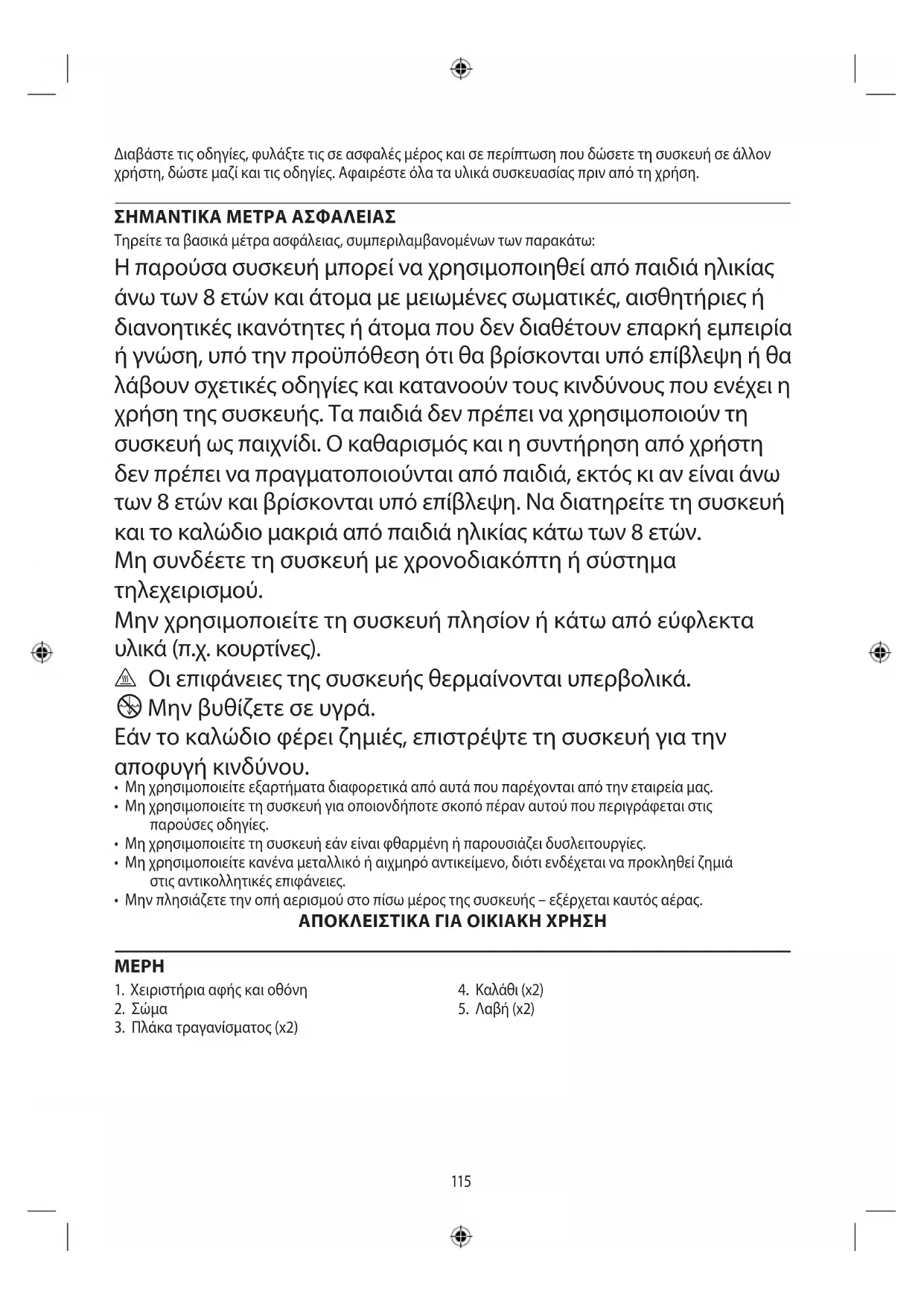 Τηρείτε τα βασικά μέτρα ασφάλειας, συμπεριλαμβανομένων των παρακάτω: Η παρούσα συσκευή μπορεί να χρησιμοποιηθεί από παιδιά ηλικίας άνω των 8 ετών και άτομα με μειωμένες σωματικές, αισθητήριες ή διανοητικές ικανότητες ή άτομα που δεν διαθέτουν επαρκή εμπειρία ή γνώση, υπό την προϋπόθεση ότι θα βρίσκονται υπό επίβλεψη ή θα λάβουν σχετικές οδηγίες και κατανοούν τους κινδύνους που ενέχει η χρήση της συσκευής. Τα παιδιά δεν πρέπει να χρησιμοποιούν τη συσκευή ως παιχνίδι. Ο καθαρισμός και η συντήρηση από χρήστη δεν πρέπει να πραγματοποιούνται από παιδιά, εκτός κι αν είναι άνω των 8 ετών και βρίσκονται υπό επίβλεψη. Να διατηρείτε τη συσκευή και το καλώδιο μακριά από παιδιά ηλικίας κάτω των 8 ετών. Μη συνδέετε τη συσκευή με χρονοδιακόπτη ή σύστημα τηλεχειρισμού. Μην χρησιμοποιείτε τη συσκευή πλησίον ή κάτω από εύφλεκτα υλικά (π.χ. κουρτίνες). ¬ Οι επιφάνειες της συσκευής θερμαίνονται υπερβολικά. i Μην βυθίζετε σε υγρά. Εάν το καλώδιο φέρει ζημιές, επιστρέψτε τη συσκευή για την αποφυγή κινδύνου.